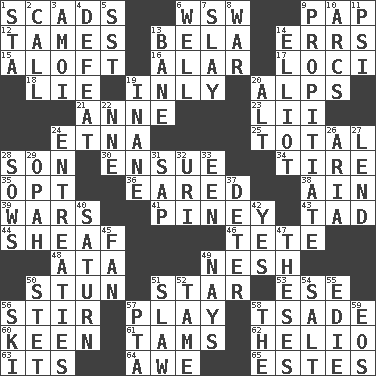 ACROSS 1. Loads 6. Compass dir. 9. Infant food 12. Corrects by punishment or discipline 13. Actor Lugosi 14. Blunders 15. Upward 16. Having or resembling wings 17. Venues 18. Whopper 19. Inwardly 20. High mountains 21. Queen of England 1702-14 23. Cards in a Roman deck? 24. Inactive volcano in Sicily 25. "_____ Recall" 28. Male offspring 30. Take place subsequently 34. Hoop that covers a wheel 35. Choose 36. Having ears or earlike features 38. The 18th letter of the Arabic alphabet 39. Armed conflicts 41. Abounding in pines 43. Small amount or degree 44. To gather and bind into a bundle 46. False hair 48. "One Day ___ Time" 49. Soft 50. Make senseless or dizzy 51. Play the lead 53. Compass dir. 56. Agitate 57. Shaw product 58. Sadhe (variant) 60. Peachy ____! 61. Scottish caps 62. Sun: prefix 63. It is 64. Deep reverence 65. _____ Park, CO DOWN 1. R.R. building 2. Give a ring to 3. Mine, in Marseilles 4. Outscore 5. Fast jet (abbr.) 6. Not ill 7. Kill 8. Armed conflict 9. Appease 10. Curves 11. Air pressure measure (abbr.) 13. Object of repulsion 14. American author Paul (1891-1958) 19. Empty; void 20. The first octave above the treble staff 22. Compass dir. 24. Pleas 26. Operatic vocal solo 27. Grant temporary use of 28. Sty mamas 29. Brightly colored fish 31. Plant excrement 32. RI univ. 33. Car or cant ending 37. Prevent from occurring 40. Titan orbits this 42. Consenting reply 45. Avid follower 47. College papers 49. Negative votes 50. Proofreading order 51. Cole _ (cabbage dish) 52. Not wild 54. Table seasoning 55. Singer Brickell 56. What Jean-Claude Killy likes to do 57. Parent Teacher Assoc. 58. Definite Article 59. Greek goddess of the dawn