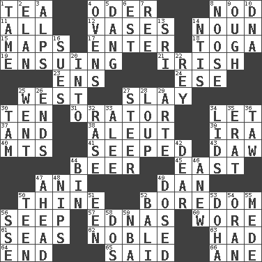ACROSS 1. Beverage made from leaves 4. River in Europe 8. Lower and raise head in agreement 11. Everything 12. Flower holders 14. Part of speech 15. Atlas contents 17. Keyboard key 18. Ancient Roman robe 19. Following as a consequence or result 21. From or relating to Ireland 23. Followers of ems 24. Compass dir. 25. 270 degrees 27. Kill 30. "___ Little Indians" 31. Speaker 34. Allow 37. Added to 38. Native American of Southwest Alaska 39. Retirement account (abbr.) 40. Mountains (abbr.) 41. Oozed 43. Fool 44. Fermented drink made from hops 45. 90 degrees 47. Cuckoo 49. One of the 12 tribes of Israel 50. One or ones belonging to thee 52. Mood resulting from idleness 56. Ooze 57. Ferber et al. 60. Had on 61. Oceans 62. Having high moral qualities 63. Possessed 64. Conclude 65. Stated 66. One (Scot) DOWN 1. Not wild 2. Flair 3. High mountains 4. Baking chambers 5. Mild oath, euphamism for damn 6. Eastern Standard Time (abbr.) 7. To sift 8. Trap for birds or small mammals 9. Ending for "Through" and "Enough" 10. Heredity factor (abbr.) 13. Indian title of respect (Mr.) 14. Nuclear Threat Initiatives 16. Takes to court 20. To the inside or interior of 22. Marina Del _, California 25. Left 26. Conclusions 27. Guide 28. Central Nebraska county 29. Johnson of "Laugh-In" 30. Scottish cap 32. To erase 33. Toward shelter 34. Flaplike coverings 35. Part of Q.E.F. 36. The 23rd letter of the Hebrew alphabet 42. Letter starter 44. Storage container 46. Afresh 47. At or in the front 48. Cuts off 49. Administered medicine 50. Adolescent 51. Car or cant ending 52. Indonesian resort city 53. Capital of the state of Qatar 54. Northwest Algerian city 55. Ancient Persian 56. Compass dir. 58. Two (Sp.) 59. Basketball assoc.