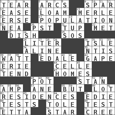 ACROSS 1. Lacerate 5. Curves 9. Practice fight 13. Comfort 14. Rich soil 15. Haggard of country music 16. Celtic language 17. Census information 19. Teachers' org. 20. Pacific Standard Time (abbr.) 21. Uncastrated adult male sheep 22. Was introduced to 23. Food container 25. Mayday 26. 61 cubic inches 30. Capri or Wright 34. Place in a line 35. Nuclear Threat Initiatives 36. Electrical Unit 39. Peak District village in England 42. Yawn 43. One of the Great Lakes 44. Cell (Danish) 46. Be inclined (to) 47. Dwellings 48. Plant holder 51. Comedian Laurel of Laurel & Hardy 54. Electrical Unit 57. A saturated hydrocarbon 58. Yet 60. Car dealer's back yard 62. Dwellings 65. Singer Brickell 66. Trials 67. Lacquered or enameled metalware 68. Trial 69. Singer James 70. Play the lead 71. Algonquian DOWN 1. Adolescent 2. Having ears or earlike features 3. Slender Brazilian palm 4. To sift 5. High mountains 6. Carrot, for example 7. Head covering 8. Obscenities 9. Put into a specified state 10. Demure 11. Medicinal plant 12. Monthly bill 15. Atlas contents 18. Nilotic language 20. Silvers or Donahue 24. Scheduled 27. Neckwear 28. Conclusion 29. Arrive at 30. Consume 31. R.R. building 32. Mouth edge 33. Compass dir. 36. Dripping 37. "We ___ not amused" (Victoria) 38. Metal container 40. Lion 41. Shade tree 45. For fear that 48. Writing tablets 49. Single 50. Portable shelters 52. Tree or shrub in the Birch family 53. Annoying sound 54. Johnson of "Laugh-In" 55. Rendezvous 56. Inconspicuous attention getter 58. Actor Lugosi 59. One who makes use of a thing 61. Wig 63. Call ___ day 64. Small bed 65. And so on (abbr.)