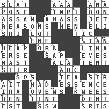 ACROSS 1. Narrow board 5. American Automobile Association (abbr.) 8. Santa ___, CA 11. Introduce or present, as a question 12. Body of Kaffir warriors 14. Spanish title 15. Indian state 17. Collect or gather 18. _ stream 19. Thinks logically 21. Layer 22. Connecticut Ivy Leaguer 23. _ Lanka 24. Car dealer's back yard 25. Nervous spasm 27. Compass dir. 28. Comedian Laurel of Laurel & Hardy 31. Pile 35. Globe 37. Pale green bean 38. Celtic language 39. Plant excrement 41. Nights before holidays 42. Vertical spar for supporting sails 43. Wing 45. Portable shelter 46. Use a spoon 47. Curve 49. Mayday 51. Beverage made from leaves 52. Title for a knight 55. Small island 57. Possessed 60. Substance 62. Retirement account (abbr.) 63. Baking chambers 65. Leg joints 66. Lair 67. Prong on a fork 68. Gouge 69. Eastern Standard Time (abbr.) 70. Compass dir. 71. Indian titles of respect DOWN 1. Practice fights 2. Failure 3. Slender Brazilian palm 4. Beverages made from leaves 5. Direct toward a target or goal 6. Nanny 7. Domed church section 8. Descriptive word 9. Christmas carol 10. Opposed to 13. Is not 16. Undercover agent 17. Michaelmas daisies 20. Words to Nanette 26. Small island 29. So be it 30. Political cartoonist Thomas 31. Equivocates 32. Part of Q.E.F. 33. Aide 34. Stone: prefix 36. Sound made by sheep 40. Food holders 44. Ancient Greek god of war 48. Keg 50. Went for two points 52. Scornful expression 53. Ancient Celtic tribe of eastern Britain 54. Musical pauses 55. Helper 56. Angers 58. Advice 59. Hiding places for outlaws 61. Conclusions 64. ___ Haven, CT
