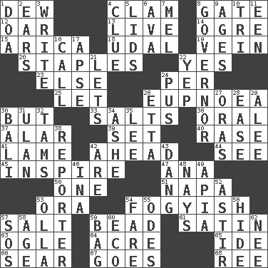 ACROSS 1. Morning condensation 4. Burrowing marine mollusk 8. Yard entry 12. Rowing implement 13. Moving, as bait 14. Legendary monster 15. N. Chile seaport 18. Freehold land 19. Distinctive style or manner 20. Paper fasteners 22. Consenting reply 23. Otherwise 24. For each 25. Allow 26. Normal relaxed breathing 30. With the exception that 33. Table seasonings 36. Of the mouth 37. Having or resembling wings 39. Put into a specified state 40. To erase 41. Unable to walk 42. Having the leading position 44. Observe 45. Heighten or intensify 47. Santa ___, CA 50. Single 51. California wine valley 53. Mouth or opening 54. Out of fashion; old fashioned 57. Table seasoning 59. Necklace unit 61. Smooth fabric 63. Stare at amorously 64. 43,560 square feet 65. Binary compound 66. Scorch 67. Travels 68. To riddle DOWN 1. ___ good deed 2. Hearing organs 3. Compose 4. A slight indication 5. Flaplike coverings 6. Actress Gardner 7. Cartoonist voice _ Blanc 8. State head 9. Eras 10. Three (prefix) 11. Car or cant ending 16. Give a ring to 17. Domed church section 21. Allows 22. Slangy assent 24. Tenth month of the Hindu calendar 26. Singer James 27. Mouths or openings 28. Relaxation 29. Toward shelter 30. Indonesian resort city 31. Uhlan (variant) 32. Scottish caps 34. American tennis player Robert 35. Area sheltered from the wind 38. Newsperson 42. "We ___ not amused" (Victoria) 43. Mild oath, euphamism for damn 46. _ tizzy (2 wds.) 48. Negative votes 49. Capital of Western Samoa 52. Having gotten out of bed 53. Water jar 54. Conductor's collection 55. Lyric poems 56. Flintstone garb 57. Mayday 58. Mature 59. Paper or plastic container 60. Environmental prefix 62. Born