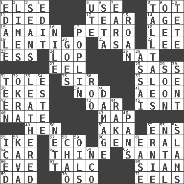 ACROSS 1. Otherwise 5. Purpose 8. Small child 11. Passed on 12. Pull into pieces 14. Mature 15. At full speed 17. Stone: prefix 18. Allow 19. Small, flat, pigmented spot on the skin 21. White ___ sheet 22. Area sheltered from the wind 23. Double-curved letter 24. Chop off 25. Floor protector 27. Snakelike fish 28. Backtalk 31. Lacquered or enameled metalware 35. Title for a knight 37. _ gin 38. Supplements with great effort 39. Allow head to fall sleepily 41. Age 42. Part of Q.E.F. 43. Boat paddle 45. Is not 46. Nathan's nickname 47. Atlas unit 49. Layer 51. Alias (abbr.) 52. Followers of ems 55. Eisenhower's nickname 57. Environmental prefix 60. Commissioned military rank 62. Auto 63. One or ones belonging to thee 65. Before Barbara or Clara 66. Night before a holiday 67. Baby powder 68. Thailand, formerly 69. Male parent 70. Bear (Spanish) 71. Snakelike fish DOWN 1. Peak District village in England 2. Citrus fruits 3. Seines 4. Prepare for publication 5. Shoshoni 6. Bristle 7. Hearing organs 8. Baron Munchausen's specialties 9. Double curve, resembling the letter S 10. Wig 13. Wander 16. "Death on the ____" 17. Cotton for raincoats, e.g. 20. Moves 26. Slender Brazilian palm 29. Within a short period 30. Emitted 31. Adolescent 32. Gumbo ingredient 33. Tough but pliablecoriaceous 34. First name in cosmetics 36. Friend of Pooh 40. Break 44. Immoral or dissolute person 48. Baking dishes 50. Remaining after all deductions 52. Bert's buddy 53. Brizilian seaport 54. Shuts with force 55. On the rocks 56. Polynesian shrub of the pepper family 58. US Secretary of Labor Elaine L. _ 59. Petroleums 61. Comfort 64. Non-commissioned officer (abbr.)