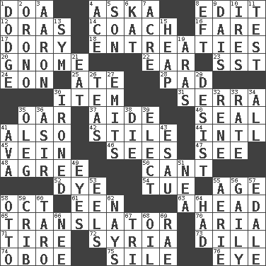 ACROSS 1. ___ good deed 4. "____ silly question..." 8. Prepare for publication 12. Mouths or openings 14. Team commander 16. Conductor's collection 17. Small, narrow, flatbottom fishing boat 18. Pleas 20. Dwarf 22. Hearing organ 23. Fast jet (abbr.) 24. Age 25. Had dinner 28. Writing tablet 30. A distinct part 31. Spanish missionary in California 35. Boat paddle 37. Helper 40. Lick closed 41. In addition 42. Vertical member of a panel or frame 44. International (abbr.) 45. Distinctive style or manner 46. Observes 47. Observe 48. Match 50. Patter 52. Color 54. Third day of the wk. 55. Grow older 58. Sep. follower 61. Car or cant ending 63. At or in the front 65. Interpreter 70. Operatic vocal solo 71. Become fatigued 72. Damascus' land 73. Deli pickle 74. Mitch Miller's instrument 75. Drop; flow; fall 76. Sight organ DOWN 1. Evade 2. U. of Maine site 3. Composer Copland 4. Adept person 5. Boy, to dad 6. Krazy ___ of comics 7. Measure of real estate 8. Lizard (obsolete) 9. Raised platform 10. Angers 11. Trial 13. Symbol (abbr.) 15. Pile 19. Caspian sea tributary 21. Erode 26. Beverages made from leaves 27. Gives off 29. Cease 30. Pressed 32. French philosopher Descartes 33. Pace 34. Everything 35. Cassini of fashion 36. SW Saudi Arabia district 38. Expire 39. Opt 41. Actress Gardner 43. He sold his birthright 49. Snake ____ (dice throw) 51. Teachers' org. 53. Snakelike fish 55. Nest on high 56. Lightheartedly 57. Peak District village in England 58. Von Bismarck 59. Baby bed with high sides 60. Edible starchy tuberous root 62. Negative votes 64. Possessed 66. Born 67. Three (prefix) 68. Petroleum 69. Actress Charlotte