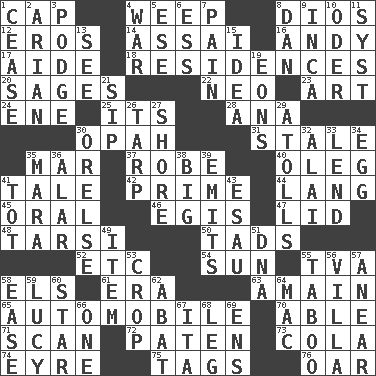 ACROSS 1. Head covering 4. Shed a tear 8. "Vaya con ____" 12. Greek god of love 14. Slender Brazilian palm 16. "60 Minutes" Commentator Rooney 17. Helper 18. Dwellings 20. Gurus 22. Modern: prefix 23. Tate display 24. Compass dir. 25. It is 28. Santa ___, CA 30. Brightly colored fish 31. Having lost freshness 35. Impair 37. Loose flowing garment 40. Cassini of fashion 41. Story 42. First class 44. Long (Scottish) 45. Relating to the mouth 46. Armor plate that protects the chest 47. Hat (slang) 48. Tarsus (plural) 50. Small amounts or degrees 52. And so on (abbr.) 54. Player for Phoenix 55. Federal power corp. 58. Raised railways 61. Epoch 63. At full speed 65. Car 70. Competent 71. Examine minutely or intensely 72. Eucharist need 73. Root beer relative 74. Jane of fiction 75. Labels 76. Rowing implement DOWN 1. Stop 2. Believer in; advocate of (suffix) 3. Plash 4. Armed conflict 5. Compass dir. 6. Curvy letter 7. Ache 8. Daniel's nick name 9. South American Indian 10. Baltic tributary 11. System (abbr.) 13. Perceive with the eye 15. The content of cognition 19. Immeasurably long periods of time 21. Small drink 26. Canvas cover 27. Dinah or Pauly 29. Ringlike coral islands and reefs 30. Threatening words 32. Jai _ 33. Grant temporary use of 34. Oval reproductive body of a fowl 35. Hindu Mythology: god of death 36. Having or resembling wings 38. Of large size 39. Gives off 41. Small child 43. Son of Isaac 49. A distinct part 51. Heredity factor (abbr.) 53. Riding implement 55. Off limits 56. Country residence 57. Approach 58. Relaxation 59. "I Love _" 60. Play the lead 62. Blind as ____ 64. Apple computer (short form) 66. Single 67. Call ___ day 68. Part of a journey 69. Followers of ems