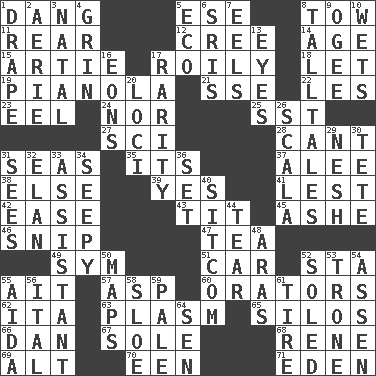 ACROSS 1. Mild oath, euphamism for damn 5. Compass dir. 8. Pull behind 11. Rump 12. Algonquian 14. Personal question 15. Nick name for Arthur 17. Agitated, as a liquid 18. Allow 19. Player piano 21. Compass dir. 22. French article 23. Snakelike fish 24. Not either 25. Fast jet (abbr.) 27. _-fi 28. Patter 31. Oceans 35. It is 37. Toward shelter 38. Otherwise 39. Affirmative reply 41. For fear that 42. Comfort 43. Teat (slang) 45. American tennis player Robert 46. Clip 47. Afternoon social gathering 49. Symbol (abbr.) 51. Automobile 52. R.R. building 55. Small island 57. Viper 60. Speakers 62. Call ___ day 63. Suffix with ecto or cyto 65. Grain storage towers 66. Daniel's nick name 67. Not divided or shared with others 68. French philosopher Descartes 69. Keyboard modifier key 70. Car or cant ending 71. Locale of original sin DOWN 1. Window treatment 2. Nest on high 3. Relating to or accompanying birth 4. Broad smile 5. Environmental prefix 6. Indian titles of respect 7. Snakelike fish 8. Baron Munchausen's specialties 9. Double curve, resembling the letter S 10. Moistens 13. Sight organs 16. Immeasurably long periods of time 17. Noteworthy scarcity 20. Venues 26. Any of the three canals of the cochlea 29. Soft 30. Wig 31. Observes 32. Flair 33. Aide 34. Oozy 36. Arrange properly for use 40. "Cheers" or "Ellen" 44. Lacerate 48. Caspian sea tributary 50. Atlas contents 52. Having a sole or soles 53. Marketplace scale 54. NE Netherlands city 55. Opera by Verdi 56. Slanted text style (abbr.) 58. _ gin 59. Light colored 61. Become fatigued 64. Elected rep.