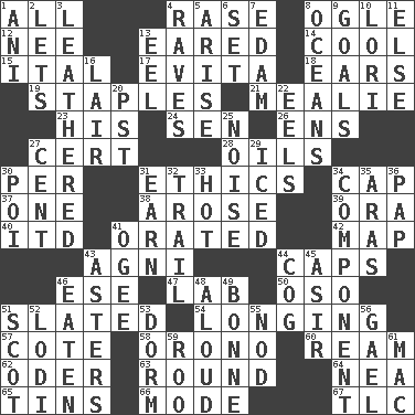 ACROSS 1. 100% 4. To erase 8. Stare at amorously 12. Born 13. Having ears or earlike features 14. Calm and collected 15. Slanted text style (abbr.) 17. Webber/Rice musical 18. Hearing organs 19. Paper fasteners 21. Ear of corn 23. Part of HMS, perhaps 24. Elected rep. 26. Followers of ems 27. Sure thing 28. Petroleums 30. For each 31. Value system 34. Head covering 37. Single 38. Came up 39. Mouth or opening 40. It would 41. Declaimed 42. Atlas unit 43. Hindu god of fire 44. Balmoral and tarboosh 46. Compass dir. 47. Experiment locale 50. Bear (Spanish) 51. Scheduled 54. Yearning 57. ____ d'Azur (French Riviera) 58. U. of Maine site 60. 480, 500 or 516 sheets of paper 62. River in Europe 63. Unit of ammunition 64. Teachers' org. 65. Canisters 66. Method 67. Affectionate concern, for short DOWN 1. Black tropical American cuckoo 2. Allows 3. Tough but pliablecoriaceous 4. All-night dance parties 5. Get up 6. Arrange properly for use 7. Dutch treat 8. Seas 9. Finish lines 10. Australian parrot (variant) 11. Otherwise 13. Snakelike fish 16. Den 20. Pacific Standard Time (abbr.) 22. Snakelike fish 25. Annoying sound 27. Penny 29. On the rocks 30. Luau course 31. Merit 32. Hang back 33. Being at a high temperature 34. Part 35. Ancient river in northeast Turkey 36. Infant food 41. Double curve, resembling the letter S 43. Michaelmas daisies 44. Gear tooth 45. SW Saudi Arabia district 46. Consumed 48. Verbally 49. Maid-servant 51. Native of Scotland 52. Farming town in central California 53. Dormintory (informal) 55. Allow head to fall sleepily 56. Highlander 59. Friend of Pooh 61. Apple computer (short form)