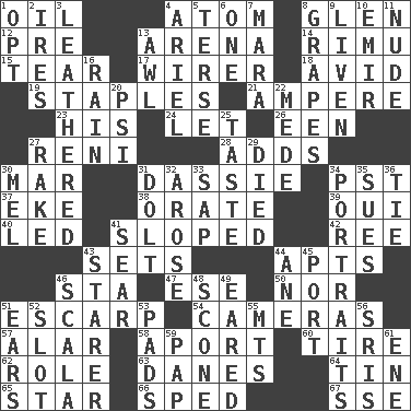 ACROSS 1. Petroleum 4. Tiny particle 8. Small, secluded valley 12. Before (prefix) 13. Sports stadium 14. Tall New Zealand timber tree 15. Pull apart 17. One who wires 18. Enthusiastic 19. Paper fasteners 21. Electrical Unit 23. Part of HMS, perhaps 24. Allow 26. Car or cant ending 27. Painter Guido (1575-1642) 28. Sums up 30. Spoil 31. Hyrax 34. Pacific Standard Time (abbr.) 37. Supplement with great effort 38. Declaim 39. Fr. "Yes" 40. Directed 41. Slanted 42. Portuguese money of account (variant) 43. Arranges properly for use 44. Tenement units (abbr.) 46. R.R. building 47. Compass dir. 50. And not 51. Fortification 54. Devices for capturing images 57. Having or resembling wings 58. To the left, to Queeg 60. Become fatigued 62. Hero or heavy, e.g. 63. Natives or inhabitants of Denmark 64. Shallow baking pan 65. Play the lead 66. Moved rapidly 67. Compass dir. DOWN 1. Choose 2. Angers 3. Resembling or made to resemble leather 4. Satellite of Uranus 5. Laconic 6. Single 7. Hindu Mythology: god of death 8. Raisin fruits 9. Make or become more lively 10. Independent ruler or chieftain 11. Naked 13. Leather borer 16. Precipitation 20. 23rd letter of the Greek alphabet 22. Ancient Persian 25. Clothes sense 27. Immoral or dissolute person 29. Passed on 30. Cartoonist voice _ Blanc 31. Dunce 32. Came up 33. Plant excrement 34. Likenesses of persons 35. Takes to court 36. Neckwear 41. Singe 43. A viewer who gazes fixedly 44. A saturated hydrocarbon 45. Left side of a ship or aircraft 46. Any of the three canals of the cochlea 48. Biscuitlike quick bread 49. Having ears or earlike features 51. Hearing organs 52. Narrow, elongated depression 53. Writing tablets 55. Mountains (abbr.) 56. Indian titles of respect 59. Infant food 61. Compass dir.