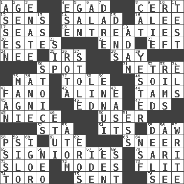 ACROSS 1. Mature 4. Mild oath 8. Certainty 12. Elected reps. 14. First course 16. Toward shelter 17. Oceans 18. Pleas 20. _____ Park, CO 22. Conclusion 23. Lizard (obsolete) 24. Born 25. Big collection agency 28. Declare 30. Specific locale 31. Distance measurement (Brit.) 35. Floor covering 37. Lacquered or enameled metalware 40. Earth 41. Papal veil 42. Place in a line 44. Scottish caps 45. Hindu god of fire 46. Pulitzer Prize-winning author Ferber 47. Begley and Asner 48. Sibling's daughter 50. One who makes use of a thing 52. R.R. building 54. ___ a Wonderful Life 55. Obsolete 58. 23rd letter of the Greek alphabet 61. Shoshoni 63. Contemptuous expression 65. Seigniories (variant) 70. Indian skirt 71. _ gin 72. Methods 73. Secret move to avoid paying debts 74. "Corrida" creature 75. Transmitted 76. Observe DOWN 1. NE Netherlands city 2. Honkers 3. Related on the mother's side 4. Compass dir. 5. Separate the seeds from cotton 6. The first octave above the treble staff 7. Have the gumption 8. Domesticated feline 9. Writer Wiesel 10. Coral collection 11. Trial 13. Compass dir. 15. Habitations of wild animals 19. First man 21. Small drink 26. Round or rotation of duties 27. Fur scarf 29. Of or pertaining to yesterday 30. Unemotional ones 32. Frog relative 33. Basketball hoops 34. Raised railways 35. Wise men 36. Queen of England 1702-14 38. Hat (slang) 39. World-weariness 41. Air blower 43. Compass direction 49. Needle case 51. Double-curved letter 53. Tiny particle 55. Allots cards 56. Nest on high 57. Compose 58. Inconspicuous attention getter 59. Grain storage tower 60. Composer Stravinsky 62. Greek god of love 64. Science/research agcy. 66. Modern: prefix 67. Binary compound 68. Car or cant ending 69. Fast jet (abbr.)