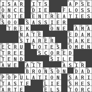ACROSS 1. Austrian river, tributary to the Danube 5. It is 8. Domed church section 12. At one time in the past 13. Pass on 14. Soft thread for cleaning between teeth 15. Short letter 16. Pleas 19. "Barney Miller" actor Jack 20. More lively and spirited 21. Long journey 23. Single 24. Wet nurse (var.) 27. Nathan's nickname 30. Dutch treat 31. A viewer who gazes fixedly 34. Immoral or dissolute person 35. Shade of tan 38. Lugs 40. Sign of things to come 41. Family _ (genealogy) 42. Tallied 44. Watch over 45. Filth; sediment 46. Deep reverence 47. Small island 50. SW Saudi Arabia district 53. "Death Wish" actor 57. June honoree 59. Census information 63. Indian skirt 64. Clothes sense 65. Untruth 66. "______ My Girl" (Turtles hit) 67. Johnson of "Laugh-In" 68. Raised railways 69. Torque (variant) DOWN 1. Charged atoms 2. Snob 3. Thespian 4. Portuguese money of account (variant) 5. The main thing one is thinking about 6. Airtight sealed metal containers 7. Arranges properly for use 8. The first octave above the treble staff 9. Luau course 10. Compass dir. 11. Double-curved letter 14. Conductor's collection 17. River (Sp.) 18. Car or cant ending 20. Three-handed card game 22. Took place subsequently 24. First man 25. Cause to be 26. So be it 28. Make lace 29. Greek god of love 30. Eats (away) 32. And so on (abbr.) 33. Vintage cars 35. Singer James 36. Ship's personnel 37. French philosopher Descartes 39. Indian title of respect (Mr.) 43. Style 47. Competent 48. Lyricist Gershwin 49. Small child 51. Potato state 52. More uncommon 54. Mediterranean tributary 55. The visible part of the earth's surface 56. Washington bills 58. Plate 59. Parent Teacher Assoc. 60. Rowing implement 61. Pacific Standard Time (abbr.) 62. Shoshoni 63. Fast jet (abbr.)
