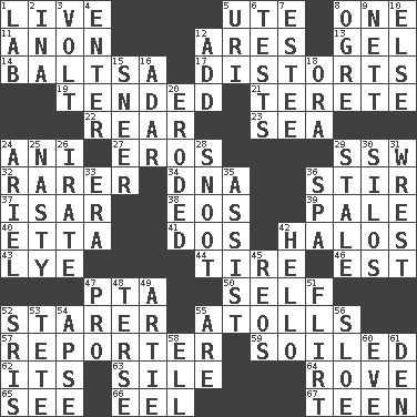 ACROSS 1. Moving, as bait 5. Shoshoni 8. Single 11. At once, immediately (arch.) 12. Ancient Greek god of war 13. Set 14. Greek mezzo-soprano Agnes 17. What propaganda does 19. Watched over 21. Cylindrical with tapered ends 22. Tail end 23. Ocean 24. Cuckoo 27. Greek god of love 29. Compass dir. 32. More uncommon 34. Heredity factor (abbr.) 36. Disorderly outburst 37. Austrian river, tributary to the Danube 38. Greek goddess of the dawn 39. Light colored 40. Singer James 41. Two (Sp.) 42. Saint headwear 43. Sodium hydroxide 44. Hoop that covers a wheel 46. Eastern Standard Time (abbr.) 47. Parent Teacher Association (abbr.) 50. Oneself 52. A viewer who gazes fixedly 55. Ringlike coral islands and reefs 57. Newsperson 59. Dirtied 62. It is 63. Drop; flow; fall 64. Be footloose 65. Observe 66. Snakelike fish 67. Adolescent DOWN 1. Experiment locale 2. _ tizzy (2 wds.) 3. Electrical Unit 4. Keyboard key 5. RI univ. 6. Trials 7. First name in cosmetics 8. Legendary monster 9. Remaining after all deductions 10. Otherwise 12. Say or write further 15. Scornful expression 16. The sixth month of the Jewish calendar 18. Mouth or opening 20. Eaten away 24. Satellite of Uranus 25. Offensive 26. Feeling or showing extreme anger 28. Snout, nose 29. Showing deterioration from age 30. Grain storage towers 31. Take or capture by force 33. Period 35. Aid 36. Health resort 42. Phone greeting 45. Vintage cars 47. Adept person 48. Laconic 49. Nick name for Arthur 51. Talk or behave amorously 52. Indian titles of respect 53. Wig 54. Domed church section 55. "We ___ not amused" (Victoria) 56. A type of plum 58. Pipe bend 60. First lady 61. Lair