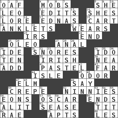 ACROSS 1. Clumsy lout 4. Disorderly crowds 8. A female animal or person 11. Lion 12. Proofreads 14. "______ My Girl" (Turtles hit) 15. Old wives' tales, e.g. 17. Ferber et al. 18. Heavy open wagon 19. Short socks 21. Puts on (as clothing) 23. Big collection agency 24. Conclude 25. Margarine 27. Of or related to the anus 30. Binary compound 31. Sounds asleep 34. Wedding promise 37. Nine, plus one 38. From or relating to Ireland 39. Teachers' org. 40. Find the sum of 41. Soft color 43. At a great distance 44. Capri or Wright 45. Aroma 47. Shade tree 49. Declare 50. Streamer paper 52. Simpletons 56. Immeasurably long periods of time 57. Motion picture award 60. Extremities 61. Set down 62. Gospel singer Marvin 63. Teat (slang) 64. Actress Charlotte 65. Flats, for short 66. French article DOWN 1. Rounded earthenware pot or jar 2. Age 3. Tined utensil 4. Confronts 5. Probability 6. Storage container 7. R.R. building 8. Pottery fragment 9. Possessive pronoun 10. Eastern Standard Time (abbr.) 13. Compass dir. 14. Examine hastily 16. Writer Wiesel 20. Greek god of love 22. Snakelike fish 25. Wrote a lyric poem 26. Grant temporary use of 27. Ascend 28. Egg locale 29. American tennis player Robert 30. Call ___ day 32. Pinches, bites 33. Of the mouth 34. A message received and understood 35. Letter starter 36. Boat paddle 42. Grant temporary use of 44. Naughty child 46. Unit of force 47. Bert's buddy 48. For fear that 49. Begets 50. Root beer relative 51. Greek goddess of the dawn 52. Political cartoonist Thomas 53. International (abbr.) 54. Singer Brickell 55. Fast planes 56. Ewer handle 58. Ocean 59. Head covering