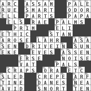 ACROSS 1. Curve 4. Indian state 9. Diluted with white 13. Sorrow 14. Don Adams' spy role 15. Scent 16. Pipe bend 17. Components 18. Dad 19. Raised railways 21. Actress Charlotte 22. Insides of hands 24. Demure 26. Biblical high priest 27. Moral principle 29. Comedian Laurel of Laurel & Hardy 30. Came up 31. Cowardly lion portrayer 33. White ___ sheet 36. Elected rep. 37. Popular '50s hangout 40. Player for Phoenix 41. Make supply last 42. Nights before holidays 43. NE Netherlands city 45. Celtic language 47. Annoying sound 48. Large container 49. Friends 50. Dice game 52. Mouth or opening 54. And so on (abbr.) 56. Downhill vehicle 57. Streamer paper 59. Sandy's bark 61. Prong on a fork 62. Natives or inhabitants of Denmark 63. Teachers' org. 64. Enthusiastic 65. Derisive sound 66. "___ Little Indians" DOWN 1. "We ___ not amused" (Victoria) 2. Governing power 3. Portable communications device 4. Cleo's killer 5. Excessive but superficial compliments 6. "Two Mules for Sister ____" 7. Johnson of "Laugh-In" 8. Mountains (abbr.) 9. Cotton for raincoats, e.g. 10. First of billions? 11. Chops off 12. Epoch 20. Indian titles of respect 22. _ dish (used to culture cells) 23. In the manner of 25. On the rocks 27. Comfort 28. Long journey 29. "______ My Girl" (Turtles hit) 31. Moving, as bait 32. "___ Maria" 33. Helper 34. Takes to court 35. Queen of England 1702-14 38. Musical pauses 39. Grandmother 44. Not divided or shared with others 45. Eluded 46. Strike 49. Some stationery 50. 154 in Roman numerals 51. Painter Guido (1575-1642) 52. NW Algerian seaport 53. Former U.S. Attorney General Janet 55. Algonquian 56. R.R. building 57. Music discs 58. Eastern Standard Time (abbr.) 60. Air blower