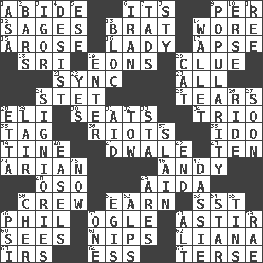 ACROSS 1. Remain 6. ___ a Wonderful Life 9. For each 12. Gurus 13. Naughty child 14. Had on 15. Came up 16. Kenny Rogers chart-topper in '80 17. Domed church section 18. _ Lanka 19. Immeasurably long periods of time 20. A slight indication 21. Synchronize (abbr.) 23. 100% 24. Proofreading order 25. Lacerates 28. Biblical high priest 30. Theater features 34. Musical group of three 35. Label 36. Disturbances 38. Wedding promise 39. Prong on a fork 41. A sleeping potion; an opiate (poet.) 43. "___ Little Indians" 44. Believer in; advocate of (suffix) 46. "60 Minutes" Commentator Rooney 48. Bear (Spanish) 49. Opera by Verdi 50. Ship's personnel 51. Merit 53. Fast jet (abbr.) 56. Silvers or Donahue 57. Stare 58. Being in motion 60. Perceives with the eye 61. Cuts off 62. Woody, climbing, usually tropical plant 63. Big collection agency 64. Curvy letter 65. Laconic DOWN 1. White ___ sheet 2. Drinking establishments 3. Composer Stravinsky 4. Stop 5. Compass dir. 6. SW Asia republic 7. Bits 8. Filthy place 9. Teen's desire 10. Celtic language 11. Portuguese money of account (variant) 13. Alliance 14. Place for singles 19. Keyboard key 20. Domesticated feline 22. Affirmative reply 24. Seigniories (variant) 26. Travel on an animal 27. Within a short period 28. Singer James 29. Den 31. Assist 32. Pull behind 33. R.R. building 37. Killed 40. Artist's stands 42. Conclude 45. Immediately 47. Small ungulate mammals of Africa 49. Ancient Greek god of war 50. "Mermaids" star 51. Armor plate that protects the chest 52. High mountains 54. Play the lead 55. Airtight sealed metal containers 56. 23rd letter of the Greek alphabet 57. Single 58. Keyboard modifier key 59. Actress Charlotte