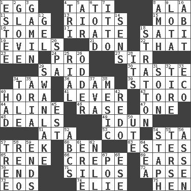 ACROSS 1. Ovum 4. Jacques of French films 8. According to 11. Volcanic refuse 13. Disturbances 15. Disorderly crowd 16. Heavy book 17. Feeling or showing extreme anger 18. Suttee (variant) 19. Vices 21. Spanish title 22. Not this but _ 23. Car or cant ending 24. Adept person 27. Title for a knight 29. Alleged 30. Clothes sense 34. The 23rd letter of the Hebrew alphabet 36. First of billions? 39. Unemotional 40. Israeli folk dance 41. Crowbar 43. "Corrida" creature 44. Place in a line 46. To erase 47. Single 48. Allots cards 49. Goddess of spring and wife of Bragi 51. "One Day ___ Time" 53. Small bed 54. R.R. building 57. Long journey 60. Benjamin's nick name 63. _____ Park, CO 65. French philosopher Descartes 66. Streamer paper 69. Hearing organs 70. Conclusion 71. Grain storage towers 72. Domed church section 73. Greek goddess of the dawn 74. Writer Wiesel 75. Layer DOWN 1. First name in cosmetics 2. Michael Jackson trademark 3. Street urchin 4. Three (prefix) 5. Wind 6. Frog relative 7. "Tell ____ the Marines!" 8. Nursemaid 9. Globular water bottle used in Asia 10. "This won't hurt ____!" 12. Set 14. Elected reps. 18. Ski resort town in Vermont 20. Health resort 25. Monetary unit of Yemen 26. More peculiar 28. ___ a Wonderful Life 29. Tchaikovsky ballet 31. Within a short period 32. Hoop that covers a wheel 33. Environmental prefix 34. Lacquered or enameled metalware 35. Roberta Peters solo 37. Actress Gardner 38. Mesonic 40. Possessed 42. Make new 45. Eastern Standard Time (abbr.) 50. Shoshoni 52. Lettered men learn these first 54. Staphylococcus 55. Laconic 56. NE Netherlands city 57. Family _ (genealogy) 58. Western Nevada city 59. Conclusions 61. One of the Great Lakes 62. 1994 drama film starring Jodie Foster 64. Ocean 67. Luau course 68. Compass dir.