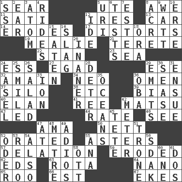 ACROSS 1. Scorch 5. Shoshoni 8. Deep reverence 11. Suttee (variant) 12. Angers 13. Auto 14. Eats (away) 17. What propaganda does 19. Ear of corn 21. Cylindrical with tapered ends 22. Comedian Laurel of Laurel & Hardy 23. Ocean 24. Curvy letter 27. Mild oath 29. Compass dir. 32. At full speed 34. Modern: prefix 36. Presage 37. Grain storage tower 38. And so on (abbr.) 39. Prejudice 40. Liveliness 41. Portuguese money of account (variant) 42. Taiwanese island in East China Sea 43. Directed 44. Assign a rank or rating to 46. Perceive with the eye 47. Nanny (var.) 50. Remaining after all deductions 52. Spoke pompously 55. Michaelmas daisies 57. Conveyance 59. Eaten away 62. Begley and Asner 63. Round or rotation of duties 64. Billionth: prefix 65. Friend of Pooh 66. Eastern Standard Time (abbr.) 67. Supplements with great effort DOWN 1. Compass dir. 2. Ewer handle 3. Tiny particle 4. Amusement-park features 5. RI univ. 6. Trials 7. First name in cosmetics 8. Measure of real estate 9. Electrical Unit 10. Celtic language 12. Binary compound 15. Eroded 16. Volcanic refuse 18. Mouth or opening 20. Sillier 24. Artist's stand 25. Grin 26. First course 28. Prevent from occurring 29. Gives off 30. Gospel singer Marvin 31. Take place subsequently 33. Electrically charged atom 35. Seas 36. Chief or king in Benin or Nigeria 42. Distance measurement 45. False hair 47. "One Day ___ Time" 48. Distance measurement (Brit.) 49. Goodbye (Sp.) 51. Marketplace scale 52. Baltic tributary 53. Redecorate 54. In addition 55. Santa ___, CA 56. Neighbor of Neb. 58. Baseball player Mel 60. Compass dir. 61. Two (Sp.)