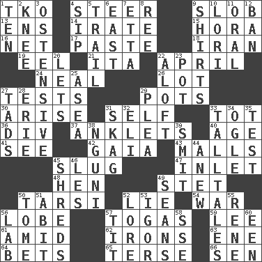 ACROSS 1. Ring climax 4. Bull 9. Messy guy 13. Followers of ems 14. Feeling or showing extreme anger 15. Israeli folk dance 16. Fish or hair follower 17. Thick mixture 18. SW Asia republic 19. Snakelike fish 21. Call ___ day 22. Showery time 24. Actress Patricia 26. Car dealer's back yard 27. Trials 29. Plant holders 30. Originate 31. Automatic 33. Small child 36. HTML Container Element 37. Short socks 40. Personal question 41. Perceive with the eye 42. Greek goddess of the earth (variant) 43. Shopping centers 45. Strike heavily 47. An arm off of a larger body of water 48. Layer 49. Proofreading order 50. Tarsus (plural) 52. Whopper 54. Armed conflict 56. Ear part 57. Ancient Roman robes 59. Area sheltered from the wind 61. Among 62. Metal shackles 63. Compass dir. 64. Stakes 65. Laconic 66. Elected rep. DOWN 1. "___ Little Indians" 2. Leg joint 3. Clearly or manifestly demonstrative 4. Small drink 5. Lag or linger behind 6. 90 degrees 7. Singer James 8. To sift 9. Upper-body garments 10. Australian parrot (variant) 11. Spoken 12. Prohibit 20. Allows 22. At or to great height 23. Cooking vessel 25. Toward the sea 27. Small amounts or degrees 28. One of the Great Lakes 29. Entreaty 31. Heroin 32. Biblical high priest 33. Baron Munchausen's specialties 34. Stare 35. Trial 38. Group of southern Bantu languages 39. Stricken, poetically 44. Afresh 45. Tears up 46. French article 49. Actors Connery and Penn 50. Heavy book 51. "This won't hurt ____!" 52. Old wives' tales, e.g. 53. Russian composer Stravinsky 55. French philosopher Descartes 56. Experiment locale 57. Teat (slang) 58. Compass dir. 60. Car or cant ending