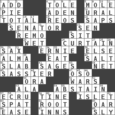 ACROSS 1. Find the sum of 4. Lacquered or enameled metalware 8. Undercover agent 12. Sliced dessert 13. An important port of Yemen 14. Mountain range 15. Add up to 18. Vintage cars 19. Plant excrements 20. Elected representative 22. Elected rep. 23. San ____ (Riviera town) 24. Be seated 25. Soggy 26. Window treatment 30. Saxophone 33. Bert's buddy 36. Otherwise 37. _ mater 39. Ingest 40. Table seasoning 41. Broad, flat, thick piece 42. Gurus 44. Fish or hair follower 45. More disrespectful 47. Bear (Spanish) 50. Mouth or opening 51. Armed conflicts 53. Insect wing 54. Refrain by choice 57. Shade of tan 59. Prong on a fork 61. Small island 63. Petty quarrel 64. Carrot, for example 65. Rowing implement 66. Relaxation 67. Lodging establishments 68. Roguish DOWN 1. Fitting 2. "Vaya con ____" 3. Prevent from occurring 4. Edible starchy tuberous root 5. River in Europe 6. Lion 7. Followers of ems 8. French bagpipes 9. NW Algerian seaport 10. Infant locale 11. Raised railways 16. Afresh 17. Unable to walk 21. Lug 22. Title for a knight 24. Institute legal proceedings 26. Quote 27. ____ Jay Lerner 28. Capri or Wright 29. Remaining after all deductions 30. Backtalk 31. Silent film actress Nazimova 32. Dec. holiday 34. Tail end 35. Tired old horse 38. Utter; complete 42. Ocean 43. Sty mamas 46. Retirement account (abbr.) 48. Suttee (variant) 49. Mouths or openings 52. Grain storage towers 53. Caspian sea tributary 54. At once, immediately (arch.) 55. Wagers 56. Actress Patricia 57. Compass dir. 58. Tax preparer (abbr.) 59. Three (prefix) 60. Electrically charged atom 62. Attempt
