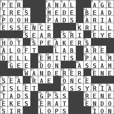 ACROSS 1. For each 4. Of or related to the anus 8. Mature 11. Angers 13. Ancient Persian 14. Necklace unit 15. "Silly old bear" 16. Groovy apts. 17. Roberta Peters solo 18. Center 21. The principal food of baleen whales 22. Singe 23. _ Lanka 25. Sight organ 26. Being at a high temperature 29. Orators 32. Upward 34. Experiment locale 35. "We ___ not amused" (Victoria) 38. Small valley 39. Gives off 41. Inside of hand 43. Turn to the right 44. Spanish title 45. Indian state 46. Nomad 50. Compass dir. 51. Ocean 54. Actress Charlotte 55. At one time in the past 57. Small island 59. Nineveh was its capital 63. Small amounts or degrees 64. Global Positioning Systems (abbr.) 67. French philosopher Descartes 68. Supplements with great effort 69. Part of Q.E.F. 70. Inside; within (prefix) 71. Title for a knight 72. Chops off 73. Electrically charged atom DOWN 1. Corncob 2. Greek god of love 3. Vintage cars 4. Electrical Unit 5. Teachers' org. 6. Say or write further 7. French article 8. Nest on high 9. Lightheartedly 10. Peak District village in England 12. "______ My Girl" (Turtles hit) 14. Drinking establishment 19. A home for chicks 20. Head covering 21. Apertif with cassis 23. Three-handed card game 24. Confederate soldiers (slang) 26. Possessed 27. Cassini of fashion 28. Lacquered or enameled metalware 30. Place in a line 31. Plant excrements 33. Soared 36. To erase 37. Enthusiasm 39. Pulitzer Prize-winning author Ferber 40. Method 42. Madame (abbr.) 45. Curves 47. Nonscientific branch of learning 48. Cooks with dry heat, as in an oven 49. Followers of ems 51. Settings 52. 1973 Nobel Price Winner (Physics) Leo 53. Tree or shrub in the Birch family 56. Jane of fiction 58. Double-curved letter 60. Painter Guido (1575-1642) 61. Southeast Asian peninsula 62. Period of immesurable duration 64. Set 65. Adept person 66. Plant excrement
