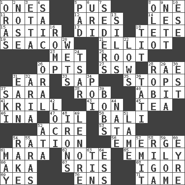 ACROSS 1. Washington bills 5. Fluid product of inflammation 8. Single 11. Round or rotation of duties 12. Ancient Greek god of war 14. French article 15. Moving about 17. "You Light Up My Life" star Conn 18. False hair 19. Manatee 21. American author Paul (1891-1958) 23. Was introduced to 25. Carrot, for example 26. Chooses 27. Compass dir. 28. Actress Charlotte 31. Ewer handle 33. Plant excrement 35. Halts 37. "Two Mules for Sister ____" 38. Director Reiner 40. "This won't hurt ____!" 41. Shrimp-like planktonic crustaceans 43. Electrically charged atom 45. Afternoon social gathering 46. _ tizzy (2 wds.) 47. Petroleum 50. Indonesian resort city 52. Measure of real estate 53. R.R. building 54. Food allowance for one day 56. Develop 61. Hindu Mythology: god of death 62. Observe 65. Poet Dickinson 66. Alias (abbr.) 67. Indian titles of respect 68. Russian composer Stravinsky 69. It is so 70. Followers of ems 71. Docile DOWN 1. Mouths or openings 2. Olfactory organ 3. Singer James 4. Ketch in the Levant 5. Groovy apt. 6. RI univ. 7. Spring feasts 8. Butter sub 9. Remaining after all deductions 10. Compass dir. 13. Grain storage towers 16. Play 18. Teat (slang) 20. Moistens 22. Moos 24. Russian ruler of old 26. Taken by mouth 28. Loose flowing garment 29. Capital of Western Samoa 30. Eastern Standard Time (abbr.) 31. Merit 32. Operatic vocal solo 34. Luau course 36. Jacques of French films 37. What Jean-Claude Killy likes to do 39. Moves up and down 42. Venues 44. Nathan's nickname 48. Metal shackles 49. Poe poem 51. Unable to walk 52. _ moment's notice (2 wds.) 54. Libertine 55. Caspian sea tributary 57. Send forth 58. Capital of Latvia 59. Seize upon or latch onto something 60. Jane of fiction 61. Fifth month 63. Metal container 64. Double-curved letter