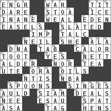 ACROSS 1. Engineer (abbr.) 5. Armed conflict 8. Teat (slang) 11. Have the gumption 12. Portico 14. Frozen water 15. Lacking in sense or substance 17. Welt 18. Paradise 19. Artist's stands 21. Scheduled 23. Naughty child 25. Baby powder 26. Famous astronaut Armstrong 27. A female animal or person 28. In the manner of 31. Heredity factor (abbr.) 33. Bar bill 35. Bodily heat indicating an inflammation 37. A blast of a horn 38. Affirmative reply 40. Remaining after all deductions 41. Tree or shrub in the Birch family 43. And not 45. Beverage made from leaves 46. Shoshoni 47. Mouth or opening 50. Petroleums 52. Nuclear Threat Initiatives 53. Basketball assoc. 54. Soup utensils 56. Scorches 61. Old (Scot.) 62. Thailand, formerly 65. Allots cards 66. Born 67. Son of Isaac 68. Petty quarrel 69. White ___ sheet 70. Label 71. Coop moms DOWN 1. Singer Brickell 2. Nanny 3. Pate de foie ____ 4. French philosopher Descartes 5. Compass dir. 6. Had dinner 7. Exposes to great heat 8. Event that recurs at intervals 9. On the rocks 10. "___ Little Indians" 13. Assad's deity 16. Writer Wiesel 18. And so on (abbr.) 20. Stricken, poetically 22. Actor Baldwin 24. Romp 26. Nathan's nickname 28. Toward shelter 29. Globular water bottle used in Asia 30. Nonscientific branch of learning 31. Dunce 32. Thickened enlargement 34. Benjamin's nick name 36. Pismires 37. The 19th letter of the Greek alphabet 39. Within a short period 42. Printing process, for short 44. Teases 48. Wash lightly 49. Help 51. Put down 52. Dreamland 54. Institutes legal proceedings 55. Entreaty 57. Soft 58. Stare wonderingly 59. Flair 60. Fast planes 61. Santa ___, CA 63. Auto club (abbr.) 64. Java container
