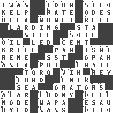 ACROSS 1. It was, poetically 5. Goddess of spring and wife of Bragi 9. Grain storage tower 13. Seaweed 14. Assign a rank or rating to 15. Lyric poems 16. Rounded earthenware pot or jar 17. Music written for nine 18. Coral ridge 19. Preparing or cooking with lard 21. R.R. building 22. Filth; sediment 23. Earth 24. Petroleum 27. Directed 28. Penny 29. The principal food of baleen whales 31. Baking dish 32. Is not 36. French philosopher Descartes 37. Fast jet (abbr.) 38. Brightly colored fish 39. At sea 40. Luau course 41. Related on the mother's side 42. "Corrida" creature 44. Zeal 46. Marina Del _, California 47. Through, poetically 48. Independent ruler or chieftain 50. Ocean 51. Speakers 54. Having or resembling wings 56. Black 58. Small valley 60. Connecting point 61. California wine valley 62. Son of Isaac 63. Colored 64. Backtalk 65. Von Bismarck DOWN 1. Ring climax 2. Water source 3. Silent film actress Nazimova 4. Practice fights 5. Pressed 6. Mild oath, euphamism for damn 7. Shoshoni 8. Fish or hair follower 9. Determination 10. Standard of perfection 11. Area sheltered from the wind 12. Order of Saint Francis (abbr.) 17. Mediterranean tributary 20. Deli pickle 21. Boy, to dad 23. Elected rep. 24. Gumbo ingredient 25. Angers 26. Actor's bit 28. Domesticated feline 30. Resembling or made to resemble leather 31. 23rd letter of the Greek alphabet 33. Coast Guard woman 34. Nathan's nickname 35. Those people 37. "Barney Miller" actor Jack 40. Adept person 41. Give off 43. Mouth or opening 44. Actresses Bloom and Felton 45. "If ____ say so..." 47. Sadhe (variant) 49. Cowboy competition 51. I made a mistake 52. State of inaction 53. Narrow board 54. Plus 55. Myrna of the movies 56. Followers of ems 57. Sound made by sheep 59. Nilotic language
