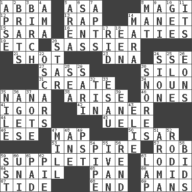ACROSS 1. Swedish rock group 5. White ___ sheet 8. Wise men 12. Demure 13. Strike 14. French painter Edouard 15. "Two Mules for Sister ____" 16. Pleas 19. And so on (abbr.) 20. More disrespectful 21. Went for two points 23. Heredity factor (abbr.) 24. Compass dir. 27. Backtalk 30. Grain storage tower 31. Make 34. Part of speech 35. Nanny 38. Originate 40. Washington bills 41. Russian composer Stravinsky 42. More lacking in sense or substance 44. Allows 45. Ubangi River tributary 46. Compass dir. 47. Atlas unit 50. Austrian river, tributary to the Danube 53. Heighten or intensify 57. Director Reiner 59. Supplementary 63. Farming town in central California 64. Slow-paced one 65. Baking dish 66. Among 67. Event that recurs at intervals 68. Conclude 69. Baking dishes DOWN 1. Domed church section 2. Naughty children 3. A tree used for making furniture 4. Nursemaid (var.) 5. Type of rug 6. Without 7. Flats, for short 8. Floor covering 9. Cuckoo 10. Unit of force equal to gravity 11. ___ a Wonderful Life 14. Hindu Mythology: god of death 17. To free from 18. Car or cant ending 20. Play the lead 22. Motion picture awards 24. The Jewish people; Israel 25. Change direction abruptly 26. Immeasurably long periods of time 28. Ocean 29. Indian skirt 30. Sounds asleep 32. Shallow baking pan 33. He sold his birthright 35. Mediterranean tributary 36. Ripens 37. Observe 39. Compass dir. 43. Writer Wiesel 47. Place where flour is made 48. One (Scot) 49. Pacific Standard Time (abbr.) 51. Scent 52. "The Thinker" sculptor 54. Corncob 55. _ the terrible 56. Tear apart 58. Auction offers 59. Fast jet (abbr.) 60. Corn or form start 61. Groovy apt. 62. Sliced dessert 63. Infant locale