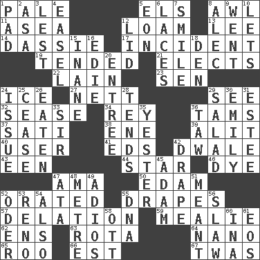 ACROSS 1. Diluted with white 5. Raised railways 8. Leather borer 11. Toward the sea 12. Rich soil 13. Area sheltered from the wind 14. Small ungulate mammals of Africa 17. Event 19. Watched over 21. Opts 22. (Had) reclined 23. Elected rep. 24. Frozen water 27. Remaining after all deductions 29. Observe 32. Gospel singer Marvin 34. Marina Del _, California 36. Scottish caps 37. Suttee (variant) 38. Compass dir. 39. Came down and settled, as after flight 40. One who uses or employs something 41. Begley and Asner 42. A sleeping potion; an opiate (poet.) 43. Car or cant ending 44. Play the lead 46. Color 47. Nursemaid (var.) 50. Dutch treat 52. Declaimed 55. Window treatments 57. Accusation by an informer 59. Ear of corn 62. Followers of ems 63. Round or rotation of duties 64. Billionth: prefix 65. Friend of Pooh 66. Eastern Standard Time (abbr.) 67. It was, poetically DOWN 1. Writing tablet 2. White ___ sheet 3. For fear that 4. Artist's stand 5. A really long time 6. Shoestrings 7. Grin 8. Actor Baldwin 9. Gone 10. Allows 12. Flaplike covering 15. Lacking in sense or substance 16. Singer Brickell 18. Lair 20. Main course 24. Come out of 25. Stop 26. Eroded 28. Looks after 29. First course 30. Poet Dickinson 31. First name in cosmetics 33. Title for a knight 35. Of or pertaining to yesterday 36. The 23rd letter of the Hebrew alphabet 42. Window treatment 45. First of billions? 47. _ moment's notice (2 wds.) 48. Distance measurement (Brit.) 49. Goodbye (Sp.) 51. Intended 52. Baltic tributary 53. Former U.S. Attorney General Janet 54. In addition 55. Heredity factor (abbr.) 56. Cole _ (cabbage dish) 58. Baseball player Mel 60. _ tizzy (2 wds.) 61. Greek goddess of the dawn