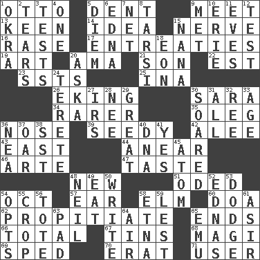 ACROSS 1. Von Bismarck 5. Scratch 9. Confront 13. Peachy ____! 14. It may be bright or harebrained 15. Boldness 16. To erase 17. Pleas 19. Nonscientific branch of learning 20. Nursemaid (var.) 21. Male child 22. Eastern Standard Time (abbr.) 23. Fast planes 25. _ tizzy (2 wds.) 26. Supplementing with great effort 30. "Two Mules for Sister ____" 34. More uncommon 35. Cassini of fashion 36. Sense of smell 39. Sleazy 42. Toward shelter 43. Compass direction 44. Approach 46. Johnson of "Laugh-In" 47. Clothes sense 48. ___ Haven, CT 51. Wrote a lyric poem 54. Sep. follower 57. Ewer handle 58. Shade tree 60. ___ good deed 62. Appease 65. Extremities 66. "_____ Recall" 67. Canisters 68. Wise men 69. Hurried 70. Part of Q.E.F. 71. One who makes use of a thing DOWN 1. Gumbo ingredient 2. Separates forcefully 3. Trials 4. Single 5. South Vietnam president (1954) 6. Pulitzer Prize-winning author Ferber 7. Fish or hair follower 8. Tarsus (plural) 9. Was introduced to 10. One of the Great Lakes 11. Nights before holidays 12. Trial 15. Nanny 18. Period of immesurable duration 20. "____ silly question..." 24. Cigar-shaped 27. Big collection agency 28. Born 29. Relatively large 30. Flew 31. 100% 32. To separate or throw off 33. Mature 36. Teachers' org. 37. Boat paddle 38. Fast jet (abbr.) 40. Heredity factor (abbr.) 41. Affirmative reply 45. Smallest unit of an element 48. Famous astronaut Armstrong 49. Erode 50. Compose 52. Ferber et al. 53. Evade 54. Elects 55. Riding implement 56. Carryall 58. Inactive volcano in Sicily 59. For fear that 61. SW Saudi Arabia district 63. Writing tablet 64. Wind 65. Australian flightless bird