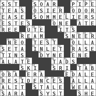 ACROSS 1. Fast jet (abbr.) 4. Fly high 8. Corncob 12. Beverages made from leaves 14. Flexible twig of a willow tree 16. Scent 17. Relaxation 18. Wine waiters 20. _____ Park, CO 22. Single 23. Had dinner 24. Portuguese money of account (variant) 25. Shoshoni 28. ___ a Wonderful Life 30. 480, 500 or 516 sheets of paper 31. Contemptuous expression 35. Modern: prefix 37. Trial 40. Water jar 41. Bristle 42. An arm off of a larger body of water 44. Raze (variant) 45. Canisters 46. Unit of force 47. Compass dir. 48. Having winglike extensions 50. Small boys 52. What Jean-Claude Killy likes to do 54. Indian title of respect (Mr.) 55. Bar bill 58. Chief or king in Benin or Nigeria 61. Epoch 63. Peak District village in England 65. Homes 70. Silent film actress Nazimova 71. Set down 72. Showing deterioration from age 73. Welt 74. "Two Mules for Sister ____" 75. System (abbr.) 76. A female animal or person DOWN 1. Bull 2. Gospel singer Marvin 3. Clothes sense 4. Distress signal 5. Bear (Spanish) 6. Direct toward a target or goal 7. San ____ (Riviera town) 8. Luau course 9. The main thing one is thinking about 10. Sweet dark-red dessert wine 11. Celtic language 13. Perceive with the eye 15. Painter Guido (1575-1642) 19. Allows 21. Institute legal proceedings 26. Jacques of French films 27. Make improvements or corrections to 29. Sounds asleep 30. Cooks with dry heat, as in an oven 32. Enthusiasm 33. Otherwise 34. Actress Charlotte 35. Famous astronaut Armstrong 36. Inactive volcano in Sicily 38. Secret 39. Portable shelters 41. R.R. building 43. Rend 49. Supplemented with great effort 51. Expire 53. Angers 55. Falsehoods 56. Assad's deity 57. Memphis, Tenn. Street 58. Mouths or openings 59. Actor Lugosi 60. SW Saudi Arabia district 62. Pismires 64. Simpleton 66. Call ___ day 67. Island 68. Raised railways 69. Put into a specified state