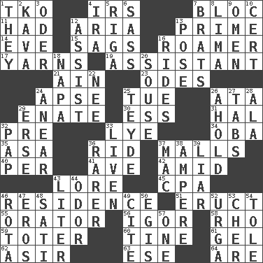 ACROSS 1. Ring climax 4. Big collection agency 7. Coalition 11. Possessed 12. Roberta Peters solo 13. A-one 14. Night before a holiday 15. Droops 16. Nomad 17. Entertaining tales 19. Aide 21. The 18th letter of the Arabic alphabet 23. Lyric poems 24. Domed church section 25. Third day of the wk. 26. "One Day ___ Time" 29. Related on the mother's side 30. Double-curved letter 31. Actor Linden 32. Before (prefix) 33. Potassium hydroxide 34. Chief or king in Benin or Nigeria 35. White ___ sheet 36. To free from 37. Shopping centers 40. For each 41. "___ Maria" 42. Among 43. Old wives' tales, e.g. 45. Numbers guy (abbr.) 46. Home 51. Spew [out] 55. Speaker 56. Composer Stravinsky 58. 17th letter of the Greek alphabet 59. Carrier 60. Prong on a fork 61. Set 62. SW Saudi Arabia district 63. Compass dir. 64. "We ___ not amused" (Victoria) DOWN 1. Those things 2. Polynesian shrub of the pepper family 3. River in Europe 4. Retirement account (abbr.) 5. Capital of Latvia 6. Backtalk 7. Naughty children 8. Pale green bean 9. Sign of something about to happen 10. An absolute certainty 12. Aid 13. Introduce or present, as a question 16. Amusement-park features 18. California wine valley 20. Lush 22. Born 24. Approach 25. Miss Universe 1986, Barbara Palacios _ 26. Hold, grip (Informal) 27. Bar bills 28. Wing 29. Celtic language 32. Infant food 33. Make or become more lively 36. More valued for its uncommonness 37. Apple computer (short form) 38. Electrical Unit 39. One who doesn't tell the truth 43. 61 cubic inches 44. Aroma 46. Roll call or roster of names 47. Greek god of love 48. Suttee (variant) 49. Quote 50. Armor plate that protects the chest 52. Capital and largest city of Mongolia 53. "Mermaids" star 54. Lacquered or enameled metalware 57. Single