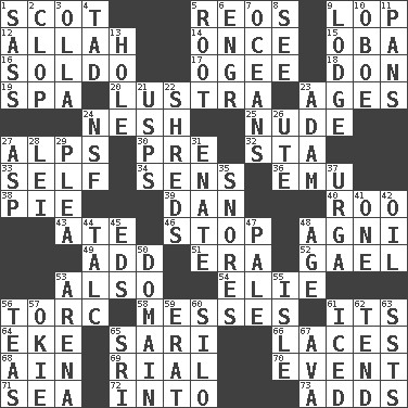 ACROSS 1. Highlander 5. Vintage cars 9. Chop off 12. Assad's deity 14. At one time in the past 15. Chief or king in Benin or Nigeria 16. Twentieth part of a lira 17. Double curve, resembling the letter S 18. Spanish title 19. Health resort 20. A period of five years 23. Grows older 24. Tender 25. Unadorned 27. High mountains 30. Before (prefix) 32. R.R. building 33. Oneself 34. Elected reps. 36. Australian flightless bird 38. Sliced dessert 39. One of the 12 tribes of Israel 40. Friend of Pooh 43. Had dinner 46. Halt 48. Hindu god of fire 49. Say or write further 51. Period 52. Highlander 53. In addition 54. Writer Wiesel 56. Torque (variant) 58. Makes clutter 61. It is 64. Make supply last 65. Indian skirt 66. Shoestrings 68. The 18th letter of the Arabic alphabet 69. Monetary unit of Yemen 70. Incident 71. Ocean 72. To the inside or interior of 73. Sums up DOWN 1. Backtalk 2. Hoof sound 3. Spanish pot 4. Small boy 5. Carrot, for example 6. Engineer (abbr.) 7. Seas 8. Perceive with the eye 9. Inn 10. Mitch Miller's instrument 11. Zero-star reviews 13. Hollow 21. United States Postal Service (abbr.) 22. Fragments 23. First of billions? 24. Science/research agcy. 26. Shoshoni 27. Cleo's killer 28. Flowery wreath 29. Entreaty 31. Related on the mother's side 35. Sounds asleep 37. Capital and largest city of Mongolia 41. Single 42. Lubricate 44. Baby powder 45. Begley and Asner 47. Light colored 48. Ripen 50. Realm 53. Sports stadium 55. Capri or Wright 56. Beverages made from leaves 57. Migrant worker of the '30s 59. Part of Q.E.F. 60. Grain storage tower 61. On the rocks 62. Watch over 63. Fast planes 65. Indian title of respect (Mr.) 67. Actress Gardner