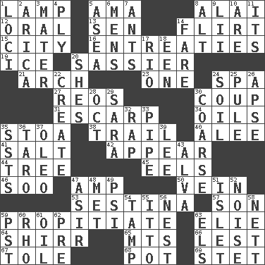 ACROSS 1. Desk light 5. Housemaid (var.) 8. Mountain range southwest of Kyrgyzstan 12. Of the mouth 13. Elected rep. 14. Seductive woman who exploits men 15. Municipality 16. Pleas 19. Frozen water 20. More impudent 21. Bowlike part 23. Single 24. Health resort 27. Vintage cars 30. Overturn; upset 31. Fortification 34. Petroleums 35. Portico 38. Go after with the intent to catch 40. Toward shelter 41. Table seasoning 42. Become visible 44. Family _ (genealogy) 45. Snakelike fish 46. "Barney Miller" actor Jack 47. Electrical Unit 50. Distinctive style or manner 53. French poetic form 57. Boy, to dad 59. Conciliate 63. Writer Wiesel 64. Bake eggs in their shells 65. Mountains (abbr.) 66. For fear that 67. Lacquered or enameled metalware 68. Plant holder 69. Proofreading order DOWN 1. Locales 2. N. Chile seaport 3. Mother 4. Apply oneself diligently 5. At sea 6. Not women's 7. Pismires 8. The first octave above the treble staff 9. Cards in a Roman deck? 10. "We ___ not amused" (Victoria) 11. It is 14. Conductor's collection 17. River (Sp.) 18. Car or cant ending 20. "______ My Girl" (Turtles hit) 22. Cause to be 24. Land 25. Whimper 26. Domed church section 28. Sep. follower 29. "Two Mules for Sister ____" 30. Unrefined 32. Reproach for some lapse or misdeed 33. Corncob 35. Fast planes 36. Edible starchy tuberous root 37. Butter sub 39. Area sheltered from the wind 43. Inventor's middle name 47. SW Saudi Arabia district 48. Was introduced to 49. 23rd letter of the Greek alphabet 51. Small island 52. Annoying sound 54. Pack (down) 55. "Tell ____ the Marines!" 56. A home for chicks 58. Remaining after all deductions 59. Pacific Standard Time (abbr.) 60. 17th letter of the Greek alphabet 61. Lubricate 62. Before (prefix) 63. Raised railways