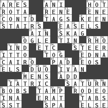 ACROSS 1. Ancient Greek god of war 5. Black tropical American cuckoo 8. Being at a high temperature 11. Round or rotation of duties 12. French philosopher Descartes 14. Compass dir. 15. Continued (abbr.) 17. Labels 18. Peachy ____! 19. Flight of steps 21. Artist's stands 23. The 18th letter of the Arabic alphabet 25. Heroin 26. Stare at amorously 27. Shallow baking pan 28. 17th letter of the Greek alphabet 31. Working for oneself (abbr.) 33. And so on (abbr.) 35. Guide 37. "Tell ____ the Marines!" 38. Coat; cloak 40. Pulitzer Prize-winning author Ferber 41. Capital of Egypt 43. Writing tablet 45. Greek goddess of the dawn 46. Raised railways 47. Superhero pair 50. "Terrible" tsar 52. Not women's 53. Find the sum of 54. Of or pertaining to medicine 56. Titan orbits this 61. Moves up and down 62. Pack (down) 65. Cowboy competition 66. _ tizzy (2 wds.) 67. Part of Q.E.F. 68. Bar bills 69. Fast jet (abbr.) 70. Health resort 71. Otherwise DOWN 1. Curves 2. Carrot, for example 3. Inactive volcano in Sicily 4. Suttee (variant) 5. Nonscientific branch of learning 6. Teachers' org. 7. Consume 8. Person who is morally reprehensible 9. Washington bills 10. Nine, plus one 13. 1973 Nobel Price Winner (Physics) Leo 16. To draw with force 18. Cask 20. Filth; sediment 22. Without 24. Remaining after all deductions 26. Scent 28. Make new 29. Coop moms 30. Mouth or opening 31. Slanted text style (abbr.) 32. Nuclear Threat Initiatives 34. Police officer (slang) 36. Adolescent 37. Frozen water 39. Greek goddess of the earth (variant) 42. River in Europe 44. Movie discs 48. Join together 49. Motion picture awards 51. The sixth month of the Jewish calendar 52. Mountains (abbr.) 54. Charged particles 55. Blind as ____ 57. Carry 58. Allodial 59. Confederate soldiers (slang) 60. Sense of smell 61. Twice 63. Atlas unit 64. Parent Teacher Assoc.