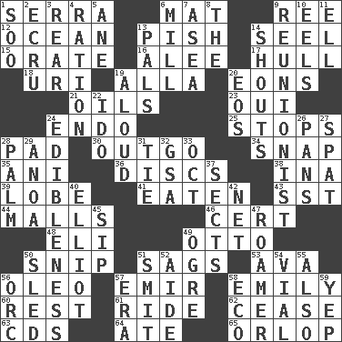 ACROSS 1. Father Junipero _ 6. Floor covering 9. Portuguese money of account (variant) 12. Sea 13. Expression of disdain 14. Stitch closed the eyes of (a falcon) 15. Speak pompously 16. Toward shelter 17. Frame or body of a ship 18. RI univ. 19. Silent film actress Nazimova 20. Immeasurably long periods of time 21. Lubricates 23. Fr. "Yes" 24. Inside; within (prefix) 25. Ceases 28. Groovy apt. 30. Outlay 34. Fastener 35. Cuckoo 36. Plates 38. _ tizzy (2 wds.) 39. Ear part 41. Eroded 43. Fast jet (abbr.) 44. Promenades 46. Foregone conclusion 48. Biblical high priest 49. Von Bismarck 50. Sever or remove by pinching or nipping 51. Settles 53. Actress Gardner 56. Butter sub 57. Independent ruler or chieftain 58. Poet Dickinson 60. Respite 61. Travel on or in a vehicle 62. Desist 63. Music discs 64. Had dinner 65. Lowest deck of a ship DOWN 1. "Barney Miller" actor Jack 2. Shade of tan 3. Stern 4. Food allowance for one day 5. A saturated hydrocarbon 6. Place where flour is made 7. Toward the sea 8. Definite Article 9. One who advocates reunion 10. Snakelike fish 11. Pipe bend 13. Friends 14. Yells 19. Verbally 20. Greek goddess of the dawn 22. Wedding promise 24. The property of being fit to eat 26. Zero-star reviews 27. Argument over a trivial matter 28. Inside of hand 29. Small Philippine buffalo 31. Neckwear 32. Girls' org. (abbr.) 33. Sep. follower 37. Religious groups 40. American author Paul (1891-1958) 42. Fish or hair follower 45. Small drink 47. Wanderer 49. Legendary monster 50. Downhill vehicle 51. Stricken, poetically 52. Helper 54. Small bottle 55. In addition 56. The grampus (Milton) 57. Epoch 58. Environmental prefix 59. Slangy assent