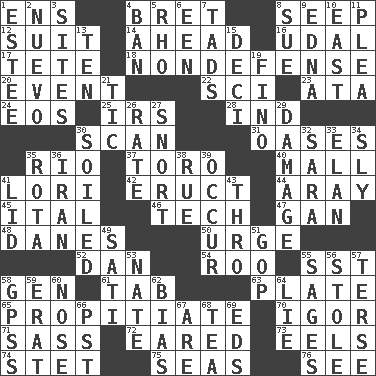 ACROSS 1. Followers of ems 4. Cy Young winner Saberhagen 8. Ooze 12. Set of matching outer garments 14. Forward in time 16. Hereditary estate 17. Wig 18. Unrelated to defense, as in spending 20. Happening 22. _-fi 23. _ moment's notice (2 wds.) 24. Greek goddess of the dawn 25. Big collection agency 28. Indiana (abbr.) 30. Examine hastily 31. Fertile tracts in a desert 35. River (Sp.) 37. "Corrida" creature 40. Promenade 41. Australian parrot (variant) 42. Spew [out] 44. Like ___ of sunshine 45. Slanted text style (abbr.) 46. Technology 47. Separate the seeds from cotton 48. Natives or inhabitants of Denmark 50. Goad 52. One of the 12 tribes of Israel 54. Friend of Pooh 55. Fast jet (abbr.) 58. Commissioned mil. rank 61. Keyboard key 63. Food holder 65. Appease 70. Russian composer Stravinsky 71. Backtalk 72. Having ears or earlike features 73. Snakelike fish 74. Proofreading order 75. Oceans 76. Observe DOWN 1. First name in cosmetics 2. New (sp.) 3. Locates 4. Bar 5. 17th letter of the Greek alphabet 6. Car or cant ending 7. Bits 8. Institute legal proceedings 9. Pulitzer Prize-winning author Ferber 10. Compass direction 11. Entreaty 13. "___ Little Indians" 15. Tenth: prefix 19. Fine (Spanish) 21. Nervous spasm 26. Pace 27. Derisive sound 29. Break 30. Dirtied 32. "Two Mules for Sister ____" 33. Liveliness 34. Wily 35. Roll call or roster of names 36. SW Asia republic 38. Sorrow 39. Happen 41. Hat (slang) 43. Through, poetically 49. Suttee (variant) 51. Republican Party 53. Nathan's nickname 55. Gurus 56. Took without asking 57. Laconic 58. Global Positioning Systems (abbr.) 59. Part of Q.E.F. 60. Characteristic smell of wine 62. Prejudice 64. Whopper 66. Pacific Standard Time (abbr.) 67. "We ___ not amused" (Victoria) 68. Beverage made from leaves 69. Begley and Asner