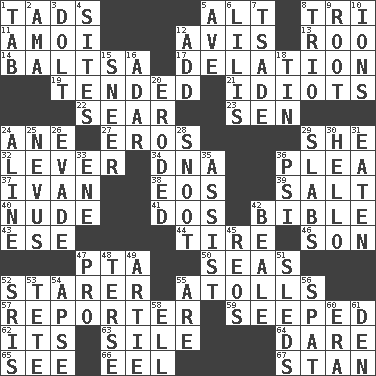 ACROSS 1. Bits 5. The first octave above the treble staff 8. Three (prefix) 11. Mine, in Marseilles 12. Advice 13. Friend of Pooh 14. Greek mezzo-soprano Agnes 17. Conveyance 19. Watched over 21. Foolish or stupid persons 22. Burn superficially 23. Elected rep. 24. One (Scot) 27. Greek god of love 29. A female animal or person 32. Prying instrument 34. Heredity factor (abbr.) 36. Entreaty 37. _ the terrible 38. Greek goddess of the dawn 39. Table seasoning 40. Naked 41. Two (Sp.) 42. The Good Book 43. Compass dir. 44. Hoop that covers a wheel 46. Male child 47. Parent Teacher Association (abbr.) 50. Oceans 52. A viewer who gazes fixedly 55. Ringlike coral islands and reefs 57. Newsperson 59. Oozed 62. It is 63. Filth; sediment 64. Have the gumption 65. Observe 66. Snakelike fish 67. Comedian Laurel of Laurel & Hardy DOWN 1. Bar bill 2. Wet nurse (var.) 3. Stupid person 4. Locates 5. "___ Maria" 6. Ms. Damita and namesakes 7. Sadhe (variant) 8. Musical group of three 9. Carrot, for example 10. Charged atoms 12. Find the sum of 15. Contemptuous expression 16. The sixth month of the Jewish calendar 18. Shallow baking pan 20. Worn away 24. Place in a line 25. Congenital growth or mark on the skin 26. Dodge 28. Snout, nose 29. Thick slices 30. Phone greeting 31. Consumed 33. Compass dir. 35. Help 36. Air pressure measure (abbr.) 42. Memphis, Tenn. Street 45. Vintage cars 47. Adept person 48. Laconic 49. Nick name for Arthur 51. Bobsleighs 52. Indian titles of respect 53. False hair 54. Domed church section 55. "We ___ not amused" (Victoria) 56. Argument over a trivial matter 58. Pipe bend 60. Period 61. Lair