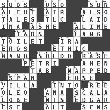 ACROSS 1. Beer foam 5. Bear (Spanish) 8. Player for Phoenix 11. Native American of Southwest Alaska 13. Atmosphere 14. In addition 15. Falsehoods 16. Affectionate concern, for short 17. Put down 18. _ tizzy (2 wds.) 19. American tennis player Robert 21. Place in a line 22. Small amounts or degrees 24. Austrian-born American filmmaker Fritz 25. Bathroom 27. Retirement account (abbr.) 29. Greek god of love 30. Value system 32. Billionth: prefix 33. Twentieth part of a lira 35. To erase 39. _ dish (used to culture cells) 41. So be it 42. Bar bill 43. Slept 45. Connect, as a bridge 48. Celtic language 49. Country estate 50. To the inside or interior of 52. To sift 55. Butter sub 56. Santa ___, CA 57. Any of the three canals of the cochlea 59. Ear part 60. Mountains (abbr.) 61. _ Allan Poe 62. Compass dir. 63. The first octave above the treble staff 64. Elected reps. DOWN 1. Suttee (variant) 2. ____ Bator 3. Conveyance 4. Take to court 5. Pledge 6. Filth; sediment 7. The grampus (Milton) 8. Killed 9. Putting into practice 10. Thickened enlargement 12. Sadhe (variant) 14. Silent film actress Nazimova 20. Fast jet (abbr.) 21. Jai _ 23. Columnist Joseph or Stewart 25. "___ Little Indians" 26. Mouth or opening 27. It would 28. 17th letter of the Greek alphabet 30. Connecticut Ivy Leaguer 31. Dice game 33. R.R. building 34. Globe 36. Electrical Measurement 37. Perceive with the eye 38. Conclusion 40. Inactive volcano in Sicily 43. Fish or hair follower 44. Came up 45. Grain storage towers 46. Military trainee 47. Medicinal plant 49. Grand slam 50. International (abbr.) 51. Political cartoonist Thomas 53. Enthusiasm 54. Hearing organs 56. Housemaid (var.) 58. Music discs