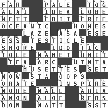 ACROSS 1. At a great distance 4. Light colored 8. Coat; cloak 11. Mountain range southwest of Kyrgyzstan 13. The main thing one is thinking about 14. Ear part 15. Remaining after all deductions 16. Prepare for publication 17. One of the Great Lakes 18. Pertaining to the sea 21. Dwellings 22. Goldbrick 23. White ___ sheet 25. Compass dir. 26. Curvy letter 29. A testis 32. Dinah or Pauly 34. Wedding promise 35. Nervous spasm 38. Lacquered or enameled metalware 39. French painter Edouard 41. A single undivided whole 43. Beverage made from leaves 44. Curve 45. National forest in Provo, Utah 46. French bagpipes 50. Arrange properly for use 51. At this time 54. R.R. building 55. I made a mistake 57. Speak pompously 59. Stimulate to action 63. Greater amount 64. Promenade 67. Roberta Peters solo 68. At once, immediately (arch.) 69. _ vera 70. Confederate soldiers (slang) 71. Spanish title 72. Electrical Unit 73. Fast jet (abbr.) DOWN 1. Papal veil 2. Actor Baldwin 3. Pace 4. Parts 5. Find the sum of 6. Flowery wreath 7. Consume 8. Singer Mel 9. Off-Broadway awards 10. Honkers 12. Slanted text style (abbr.) 14. Lion 19. Nathan's nickname 20. Ending with capital 21. Actor Linden 23. Assistant 24. Native of Scotland 26. Eastern Standard Time (abbr.) 27. Guess 28. Flatfish 30. A color or tint 31. Needle holder 33. 480, 500 or 516 sheets of paper 36. Restaurants 37. Quote 39. Vertical spar for supporting sails 40. Type of rug 42. Make lace 45. United States Postal Service (abbr.) 47. Purpose 48. Rest room 49. Period of immesurable duration 51. Roamer 52. U. of Maine site 53. Make _____ (do battle with) 56. Coast Guard woman 58. "___ Little Indians" 60. Angers 61. Teases 62. 90 degrees 64. Informal term for the mouth 65. Insect wing 66. Car dealer's back yard