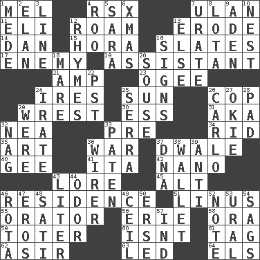 ACROSS 1. Cartoonist voice _ Blanc 4. Acura sports coupe 7. ____ Bator 11. Connecticut Ivy Leaguer 12. Wander 13. Wear away 14. Daniel's nick name 15. Israeli folk dance 16. Chalkboards 17. Foe 19. Helper 21. Electrical Unit 23. Double curve, resembling the letter S 24. Angers 25. Player for Phoenix 26. Police officer (slang) 29. Obtain by seizing forcibly or violently 30. Double-curved letter 31. Alias (abbr.) 32. Teachers' org. 33. Before (prefix) 34. To free from 35. Nonscientific branch of learning 36. Armed conflict 37. A sleeping potion; an opiate (poet.) 40. Unit of force equal to gravity 41. Call ___ day 42. Billionth: prefix 43. Old wives' tales, e.g. 45. The first octave above the treble staff 46. Dwelling 51. "_ and Lucy" (Charlie Brown theme song) 55. Speaker 56. 4th largest of the Great Lakes 58. Mouth or opening 59. Carrier 60. Is not 61. Label 62. SW Saudi Arabia district 63. Directed 64. Raised railways DOWN 1. Ancient Persian 2. Enthusiasm 3. Actor's bit 4. Friend of Pooh 5. "Two Mules for Sister ____" 6. Dec. holiday 7. A salt of uric acid 8. Globular water bottle used in Asia 9. An important port of Yemen 10. Egg locale 12. Poems 13. Otherwise 16. Public displays of written messages 18. Female horse 20. Lush 22. Pacific Standard Time (abbr.) 24. Feeling or showing extreme anger 25. Father Junipero _ 26. Monte _, Las Vegas Hotel/Casino 27. Migrant worker of the '30s 28. Groovy apt. 29. Past tense of be (plural) 32. Tired old horse 33. Eucharist need 36. One who wires 37. Heredity factor (abbr.) 38. Place for singles 39. Against 43. 61 cubic inches 44. Aroma 46. Roll call or roster of names 47. Greek god of love 48. Suttee (variant) 49. To provide with a ceiling 50. Celtic language 52. Make mention of 53. Mountain range 54. Settles 57. Indiana (abbr.)