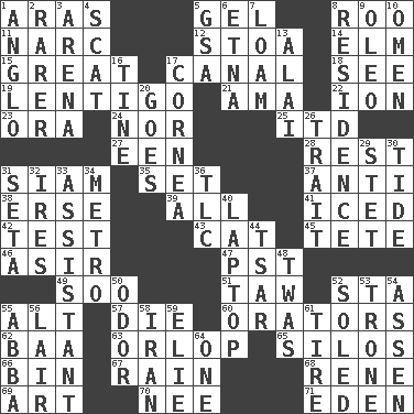 ACROSS 1. Ancient river in northeast Turkey 5. Set 8. Friend of Pooh 11. Drug cop 12. Portico 14. Shade tree 15. Relatively large 17. Lessep's creation 18. Observe 19. Small, flat, pigmented spot on the skin 21. Wet nurse (var.) 22. Electrically charged atom 23. Mouth or opening 24. Or not 25. It would 27. Car or cant ending 28. Take ten 31. Thailand, formerly 35. Put into a specified state 37. Against 38. Celtic language 39. Everything 41. On the rocks 42. Trial 43. Feline 45. Wig 46. SW Saudi Arabia district 47. Pacific Standard Time (abbr.) 49. "Barney Miller" actor Jack 51. The 23rd letter of the Hebrew alphabet 52. R.R. building 55. The first octave above the treble staff 57. Pass on 60. Speakers 62. Sound made by sheep 63. Lowest deck of a ship 65. Grain storage towers 66. Storage container 67. Water falling in drops from the sky 68. French philosopher Descartes 69. Tate display 70. Born 71. Locale of original sin DOWN 1. White American of non-Hispanic descent 2. Less widely known 3. Sports stadium 4. Scram, to a cat 5. Girls' org. (abbr.) 6. Inactive volcano in Sicily 7. Rich soil 8. Dwelling 9. Butter sub 10. Sign of things to come 13. Jai ____ 16. Prong on a fork 17. Pupil covering 20. Leaves 26. Distinguishing feature 29. Proofreading order 30. Event that recurs at intervals 31. Bristle 32. Angers 33. Aide 34. Paris' subway 36. Affectionate concern, for short 40. Portable computer 44. Russian ruler of old 48. It was, poetically 50. Scent 52. Having a sole or soles 53. Marketplace scale 54. NE Netherlands city 55. Swedish rock group 56. Den 58. SW Asia republic 59. Writer Wiesel 61. Become fatigued 64. Single
