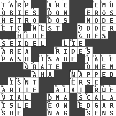 ACROSS 1. Canvas cover 5. "We ___ not amused" (Victoria) 8. Australian flightless bird 11. Off-Broadway awards 13. Spanish title 14. Greek god of love 15. Paris' subway 16. Two (Sp.) 17. Connecting point 18. And so on (abbr.) 19. A home for chicks 21. More peculiar 22. Flintstone garb 24. Leaves 25. Beer mug 27. Untruth 29. Type of rug 30. Amusement-park features 32. Romantic infatuation 33. Sadhe (variant) 35. Lie 39. Declaim 41. Sign of something about to happen 42. Housemaid (var.) 43. Slept 45. Is not 48. Celtic language 49. Nick name for Arthur 50. Mountain range southwest of Kyrgyzstan 52. Regret 55. Small bottle 56. Heredity factor (abbr.) 57. Any of the three canals of the cochlea 59. Small island 60. Age 61. _ Allan Poe 62. A female animal or person 63. Tired old horse 64. Elected reps. DOWN 1. Heavy book 2. Collude with 3. Actors Guy, Robert Welles, and Clint 4. For each 5. Sums up 6. Carrot, for example 7. Followers of ems 8. Eat (away) 9. Methods 10. One who makes use of a thing 12. Message 14. Inside; within (prefix) 20. Snakelike fish 21. Double curve, resembling the letter S 23. Potato state 25. Plant excrement 26. Epoch 27. Hat (slang) 28. Binary compound 30. Actress Charlotte 31. Constricts 33. Scottish cap 34. R.R. building 36. Electrical Measurement 37. Area sheltered from the wind 38. Conclusion 40. Assign a rank or rating to 43. Teachers' org. 44. Originate 45. From or relating to Ireland 46. Having lost freshness 47. "Death on the ____" 49. Deliberation 50. Small Philippine buffalo 51. Austrian-born American filmmaker Fritz 53. ____ Bator 54. Hearing organs 56. Lair 58. Music discs