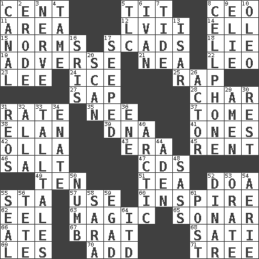 ACROSS 1. Penny 5. Teat (slang) 8. Corporate head (abbr.) 11. Type of rug 12. 57 in ancient Rome 14. Pipe bend 15. Typical models 17. Oodles 18. Whopper 19. Contrary to your interests or welfare 21. Teachers' org. 22. Lion 23. Area sheltered from the wind 24. Frozen water 25. Reproach for some lapse or misdeed 27. Plant excrement 28. Burn to charcoal 31. Pace 35. Born 37. Heavy book 38. Enthusiasm 39. Heredity factor (abbr.) 41. Washington bills 42. Spanish pot 43. Period 45. Monthly bill 46. Table seasoning 47. Music discs 49. Nine, plus one 51. Beverage made from leaves 52. ___ good deed 55. R.R. building 57. Purpose 60. Heighten or intensify 62. Snakelike fish 63. Mysterious quality of enchantment 65. Echolocation 66. Had dinner 67. Naughty child 68. Suttee (variant) 69. French article 70. Find the sum of 71. Relationship diagram DOWN 1. Lessep's creation 2. Wear away 3. Effrontery 4. Docile 5. Affectionate concern, for short 6. _ the terrible 7. Periodic rise and fall of the sea level 8. Portable communications device 9. Writer Wiesel 10. Margarine 13. Austrian river, tributary to the Danube 16. Indian titles of respect 17. Oozed 20. Glance over 26. Thespian 29. So be it 30. Repose 31. Vintage cars 32. Silent film actress Nazimova 33. Baron Munchausen's specialties 34. Maternal 36. Compass dir. 40. Northern region 44. An important port of Yemen 48. Backtalk 50. Unfeeling 52. Middle Eastern gold or silver currency 53. Speak pompously 54. Nest on high 55. Lick closed 56. Wig 58. "Two Mules for Sister ____" 59. Mild oath 61. Mail 64. It would