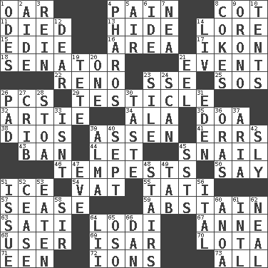 ACROSS 1. Rowing implement 4. Ache 8. Small bed 11. Passed on 13. Flintstone garb 14. Old wives' tales, e.g. 15. Singer Brickell 16. Type of rug 17. Picture 18. Legislator 21. Incident 22. Western Nevada city 23. Compass dir. 25. Mayday 26. Personal Computers (abbr.) 29. One of the two male reproductive glands 32. Nick name for Arthur 34. In the manner of 35. ___ good deed 38. "Vaya con ____" 39. NE Netherlands city 41. Blunders 43. Forbid 44. Allow 45. Slow-paced one 46. Storms 50. Declare 51. Frozen water 54. Large container 55. Jacques of French films 57. Gospel singer Marvin 59. Choose not to consume 63. Suttee (variant) 64. Farming town in central California 67. Singer Murray 68. One who makes use of a thing 69. Austrian river, tributary to the Danube 70. Globular water bottle used in Asia 71. Car or cant ending 72. Charged particles 73. Everything DOWN 1. Lyric poems 2. Assistant 3. It's straight from the horse's mouth 4. N Egypt peninsula 5. Wind 6. Binary compound 7. Teachers' org. 8. Popular sodas 9. U. of Maine site 10. Portable shelters 12. Letter starter 14. 54 in ancient Rome 19. False hair 20. Single 21. Snakelike fish 23. Drop; flow; fall 24. Examine minutely or intensely 26. Writing tablet 27. Baby bed with high sides 28. Portico 30. Clothes sense 31. Paradise 33. Is not 36. Mouths or openings 37. Roberta Peters solo 39. _ mater 40. Back-to-school mo. 42. Roguish 45. Fast planes 47. Night before a holiday 48. Flight of steps 49. Bar bill 51. Come out of 52. Desist 53. Consumed 56. Slanted text style (abbr.) 58. Title for a knight 60. Small Philippine buffalo 61. International (abbr.) 62. Actress Patricia 64. Cards in a Roman deck? 65. Bear (Spanish) 66. One of the 12 tribes of Israel