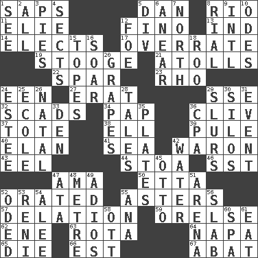 ACROSS 1. Plant excrements 5. One of the 12 tribes of Israel 8. River (Sp.) 11. Writer Wiesel 12. Fine (Spanish) 13. Indiana (abbr.) 14. Opts 17. Make much ado about nothing 19. Moe Howard, for one 21. Ringlike coral islands and reefs 22. Coast Guard woman 23. 17th letter of the Greek alphabet 24. Car or cant ending 27. Part of Q.E.F. 29. Compass dir. 32. Loads 34. Infant food 36. 154 in Roman numerals 37. Carryall 38. Pipe bend 39. Whine 40. Style 41. Ocean 42. Make _____ (do battle with) 43. Snakelike fish 44. Portico 46. Fast jet (abbr.) 47. Housemaid (var.) 50. Singer James 52. Declaimed 55. Michaelmas daisies 57. Accusation by an informer 59. Threatening words 62. Compass dir. 63. Roll call or roster of names 64. California wine valley 65. Expire 66. Eastern Standard Time (abbr.) 67. Blind as ____ DOWN 1. Observe 2. 100% 3. Sliced desserts 4. Religious groups 5. HTML Container Element 6. Approach 7. _ pole 8. Monetary unit of Yemen 9. International (abbr.) 10. Lyric poems 12. Enemy 15. Drinks excessively 16. Fly high 18. Friend of Pooh 20. Wine fruits 24. First name in cosmetics 25. Learning spot: Fr. 26. Relating to or accompanying birth 28. Stories 29. Runs notes together 30. Grain storage towers 31. Incident 33. Lair 35. Food holders 36. Accounting whiz (abbr.) 42. Wetness 45. Von Bismarck 47. "One Day ___ Time" 48. Distance measurement (Brit.) 49. Goodbye (Sp.) 51. Sports stadium 52. Wrote a lyric poem 53. Painter Guido (1575-1642) 54. Toward shelter 55. Santa ___, CA 56. Broad, flat, thick piece 58. Baseball player Mel 60. Health resort 61. Erode