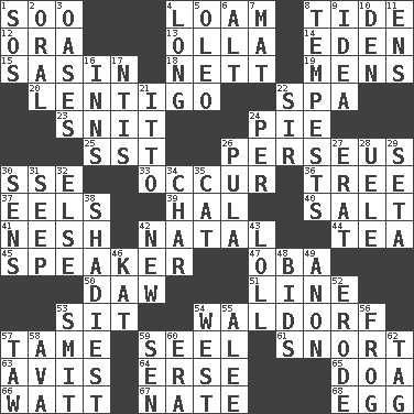 ACROSS 1. "Barney Miller" actor Jack 4. Rich soil 8. Event that recurs at intervals 12. Mouth or opening 13. Rounded earthenware pot or jar 14. Paradise 15. Indian antelope 18. Remaining after all deductions 19. Not women's 20. Small, flat, pigmented spot on the skin 22. Health resort 23. In a ____ (agitated or irritated) 24. Sliced dessert 25. Fast jet (abbr.) 26. Son of Zeus who helped slay Medusa 30. Compass dir. 33. Come to pass 36. Woody plant 37. Snakelike fish 39. Actor Linden 40. Table seasoning 41. Soft 42. Relating to or accompanying birth 44. Afternoon social gathering 45. Orator 47. Chief or king in Benin or Nigeria 50. Obsolete 51. Actor's bit 53. Be seated 54. Apple salad 57. Docile 59. Sew up the eyelids of hawks and falcons 61. Derisive sound 63. Deliberation 64. Celtic language 65. ___ good deed 66. Electrical Unit 67. Nathan's nickname 68. Oval reproductive body of a fowl DOWN 1. Distress signal 2. Spoken 3. Fertile tracts in a desert 4. Having great length 5. Margarine 6. Keyboard modifier key 7. Floor covering 8. Storms 9. It may be bright or harebrained 10. Lair 11. Followers of ems 16. Restaurants 17. Nuclear Threat Initiatives 21. "Tell ____ the Marines!" 22. Title for a knight 24. For each 26. Monetary unit of Botswana 27. Part of Q.E.F. 28. Ubangi River tributary 29. Stalk of a moss capsule 30. Elected reps. 31. Ooze 32. Otherwise 34. Burn to charcoal 35. Domesticated feline 38. Most questionable 42. ___ Haven, CT 43. Hang loosely or laxly 46. Krazy ___ of comics 48. Auction offers 49. Soon (poet.) 52. Eat (away) 53. Stricken, poetically 54. 270 degrees 55. Toward shelter 56. Tree-dwelling hopper 57. The 23rd letter of the Hebrew alphabet 58. Actress Gardner 59. Elected rep. 60. Epoch 62. Label