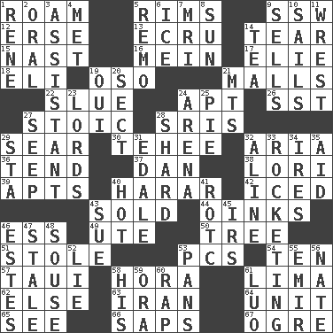 ACROSS 1. Wander aimlessly 5. Basketball hoops 9. Compass dir. 12. Celtic language 13. Shade of tan 14. Pull apart 15. Political cartoonist Thomas 16. Count _ (2 wds.) 17. Writer Wiesel 18. Biblical high priest 19. Bear (Spanish) 21. Shopping centers 22. Change direction abruptly 24. Fitting 26. Fast jet (abbr.) 27. Unemotional 28. Indian titles of respect 29. Wither 30. Giggle 32. Operatic vocal solo 36. Look after 37. One of the 12 tribes of Israel 38. Australian parrot (variant) 39. Tenement units (abbr.) 40. Ethiopian city, capital of Harari 42. On the rocks 43. Disposed of to a purchaser 44. Pig sounds 46. Curvy letter 49. Shoshoni 50. Family _ (genealogy) 51. Took without asking 53. Personal Computers (abbr.) 54. Nine, plus one 57. "Change" in Tahitian 58. Israeli folk dance 61. Pale green bean 62. Otherwise 63. SW Asia republic 64. A single undivided whole 65. Observe 66. Plant excrements 67. Legendary monster DOWN 1. French philosopher Descartes 2. Of the mouth 3. Helper 4. Was introduced to 5. San ____ (Riviera town) 6. Frozen water 7. Medical imaging device (abbr.) 8. Player for Phoenix 9. Exchanges for money 10. Travel by water 11. Obtain by seizing forcibly or violently 14. Afternoon social gathering 19. Fr. "Yes" 20. Religious group 21. Mountains (abbr.) 23. Titled peers of a realm 24. Sports stadium 25. Sliced dessert 27. Ooze 28. Pottery fragment 29. R.R. building 31. Peak District village in England 32. Place in a line 33. Shooting up abruptly 34. Angers 35. Assist 40. Being at a high temperature 41. College mil. group 43. Take to court 45. Big collection agency 46. _____ Park, CO 47. Showing deterioration from age 48. Boozer 52. Whopper 53. Zero-star reviews 55. Arab leader 56. Nathan's nickname 58. Part of HMS, perhaps 59. Mouth or opening 60. Reproach for some lapse or misdeed 61. Nilotic language