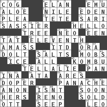 ACROSS 1. Gear tooth 4. Enthusiasm 8. Australian flightless bird 11. Medicinal plant 13. The longest river in the world 14. Locale of original sin 15. Entreaty 16. Wig 17. Indian skirt 18. More lively and spirited 21. Phone greeting 22. Woody plant 23. Modern: prefix 25. Car or cant ending 26. Make lace 29. Veterans Day date 32. Collect or gather 34. It would 35. Mouth or opening 38. Dunce 39. Table seasonings 41. Crowds into 43. Frozen water 44. 100% 45. Dried seaweed eaten as food 46. Copy Pinocchio 50. Baking dish 51. _ tizzy (2 wds.) 54. "One Day ___ Time" 55. Ancient Greek god of war 57. Drug addict 59. Flamboyance 63. At once, immediately (arch.) 64. Is not 67. Within a short period 68. Possessive pronoun 69. Western Nevada city 70. Disposed of to a purchaser 71. Baseball player Mel 72. Ooze 73. Lion DOWN 1. Smile enhancers 2. Rounded earthenware pot or jar 3. Travels 4. Main course 5. Whopper 6. The first octave above the treble staff 7. Born 8. Peak District village in England 9. Haggard of country music 10. The state of being joined or united 12. 90 degrees 14. Compass dir. 19. Angers 20. Snakelike fish 21. Being at a high temperature 23. Remaining after all deductions 24. Extremities 26. Bit 27. Mine, in Marseilles 28. Baby powder 30. Country residence 31. Same (prefix) 33. Proofreading order 36. Play 37. Swedish rock group 39. Table seasoning 40. Silent film actress Nazimova 42. Player for Phoenix 45. Peachy ____! 47. Ewer handle 48. Portable computer 49. Retirement account (abbr.) 51. Potato state 52. Music written for nine 53. To the left, to Queeg 56. Backtalk 58. Followers of ems 60. Calm and collected 61. Hollow 62. Inside; within (prefix) 64. Big collection agency 65. Perceive with the eye 66. Compass dir.