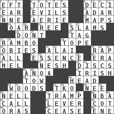 ACROSS 1. Newt 4. Lugs 9. Tenth: prefix 13. Ewer handle 14. Vices 15. The sixth month of the Jewish calendar 16. Compass dir. 17. Nest on high 18. Atlas contents 19. Boat paddle 21. Portuguese money of account (variant) 22. Hits or strikes with great force 24. Do not 26. Label 27. Role for Stallone 29. Drink excessively 30. Off-Broadway awards 31. Jai _ 33. Hit sharply and swiftly 36. Everything 37. Center 40. Period 41. Cartoonist voice _ Blanc 42. Tender 43. Flat circles 45. Small Philippine buffalo 47. From or relating to Ireland 48. Pull behind 49. Froth on beer 50. Forest 52. Ring climax 54. Born 56. 1994 drama film starring Jodie Foster 57. _____ steamer (cargo ship) 59. Basketball assoc. 61. Give a ring to 62. Crowbar 63. Small bed 64. Mouths or openings 65. Desist 66. Compass dir. DOWN 1. Car or cant ending 2. Papal veil 3. Excercise machine 4. Beverage made from leaves 5. Unconcealed 6. Become fatigued 7. Writer Wiesel 8. Compass dir. 9. Break 10. Dutch treat 11. Balmoral and tarboosh 12. Big collection agency 20. Loose flowing garment 22. Unemotional 23. Pet locale 25. Olfactory organ 27. Wander aimlessly 28. Competent 29. Hyperbolic tangent 31. At sea 32. French article 33. Home 34. Arches 35. Romantic infatuation 38. Frozen precipitation (plural) 39. Singer Brickell 44. SW Asia republic 45. Ringlike coral islands and reefs 46. Allow head to fall sleepily 49. Residences 50. Erode 51. Rounded earthenware pot or jar 52. Family _ (genealogy) 53. Polynesian shrub of the pepper family 55. Inky black, to poets 56. Non-commissioned officer (abbr.) 57. Affectionate concern, for short 58. Before (prefix) 60. Had dinner
