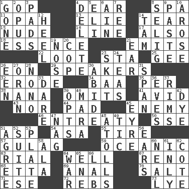 ACROSS 1. Republican Party 4. Letter starter 8. Health resort 11. Brightly colored fish 13. Writer Wiesel 14. Pull into pieces 15. Unadorned 16. Actor's bit 17. In addition 18. Center 21. Sends forth 22. Spoils 23. R.R. building 25. Turn to the right 26. Period of immesurable duration 29. Orators 32. Wear away 34. Sound made by sheep 35. For each 38. Nanny 39. Leaves out 41. Enthusiastic 43. And not 44. Groovy apt. 45. Foe 46. Plea 50. Compass dir. 51. Viper 54. White ___ sheet 55. Hoop that covers a wheel 57. Russian prison camp 59. Pertaining to the sea 63. Monetary unit of Yemen 64. Water source 67. Former U.S. Attorney General Janet 68. Singer James 69. Of or related to the anus 70. Table seasoning 71. Compass dir. 72. Confederate soldiers (slang) 73. Potassium hydroxide DOWN 1. Went 2. Musical composition 3. Writing tablets 4. Keyboard key 5. Connecticut Ivy Leaguer 6. The 18th letter of the Arabic alphabet 7. To riddle 8. Former Milwaukee Brewers owner Bud 9. Thick mixture 10. Came up 12. The bottom of a shoe or boot 14. Scottish cap 19. Characteristic smell of wine 20. Police officer (slang) 21. Ewer handle 23. Three-handed card game 24. Beverages made from leaves 26. Car or cant ending 27. NW Algerian seaport 28. Words to Nanette 30. Remain 31. Connect, as a bridge 33. Have the gumption 36. Nights before holidays 37. Basketball hoops 39. Chooses 40. Hindu Mythology: god of death 42. Color 45. Jane of fiction 47. Tired old horse 48. Ringlike coral islands and reefs 49. Nervous spasm 51. Match 52. Sets or collections 53. Food holder 56. Hearing organs 58. Chicken ___ king 60. Actress Patricia 61. Inwardly 62. ____ d'Azur (French Riviera) 64. Armed conflict 65. Compass dir. 66. Experiment locale