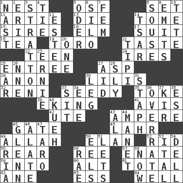 ACROSS 1. A home for chicks 5. Order of Saint Francis (abbr.) 8. Arrange properly for use 11. Nick name for Arthur 13. Pass on 14. Heavy book 15. Titles for men of rank and authority 16. Shade tree 17. Set of matching outer garments 18. Beverage made from leaves 19. "Corrida" creature 21. Clothes sense 22. Adolescent 24. Angers 25. Main course 27. Viper 29. Soon (poet.) 30. Ms. Damita and namesakes 32. Painter Guido (1575-1642) 33. Shabby and untidy 35. Casino tip 39. Supplementing with great effort 41. Deliberation 42. Shoshoni 43. Electrical Unit 45. Yard entry 48. Cowardly lion portrayer 49. Assad's deity 50. Flair 52. To free from 55. Stern 56. To separate or throw off 57. Related on the mother's side 59. To the inside or interior of 60. Keyboard modifier key 61. Add up to 62. A saturated hydrocarbon 63. Double-curved letter 64. Not ill DOWN 1. Political cartoonist Thomas 2. 4th largest of the Great Lakes 3. Ski resort town in Vermont 4. Make a knot 5. Baltic tributary 6. Grain storage tower 7. Opposite of masc. 8. Lush 9. Sends forth 10. False hair 12. First name in cosmetics 14. Russian ruler of old 20. Single 21. Native american tent (variation) 23. Bert's buddy 25. Hearing organ 26. Compass dir. 27. Assist 28. Stealthy 30. Part of a journey 31. Staphylococcus 33. Be seated 34. Compass dir. 36. Make much ado about nothing 37. Apertif with cassis 38. Compass dir. 40. Malaysian steamed pastry 43. Insect wing 44. French painter Edouard 45. American astronaut and politician John 46. Having winglike extensions 47. Edible starchy tuberous root 49. Operatic vocal solo 50. Snakelike fish 51. Allows 53. Slanted text style (abbr.) 54. Small valley 56. Actress Charlotte 58. At this time